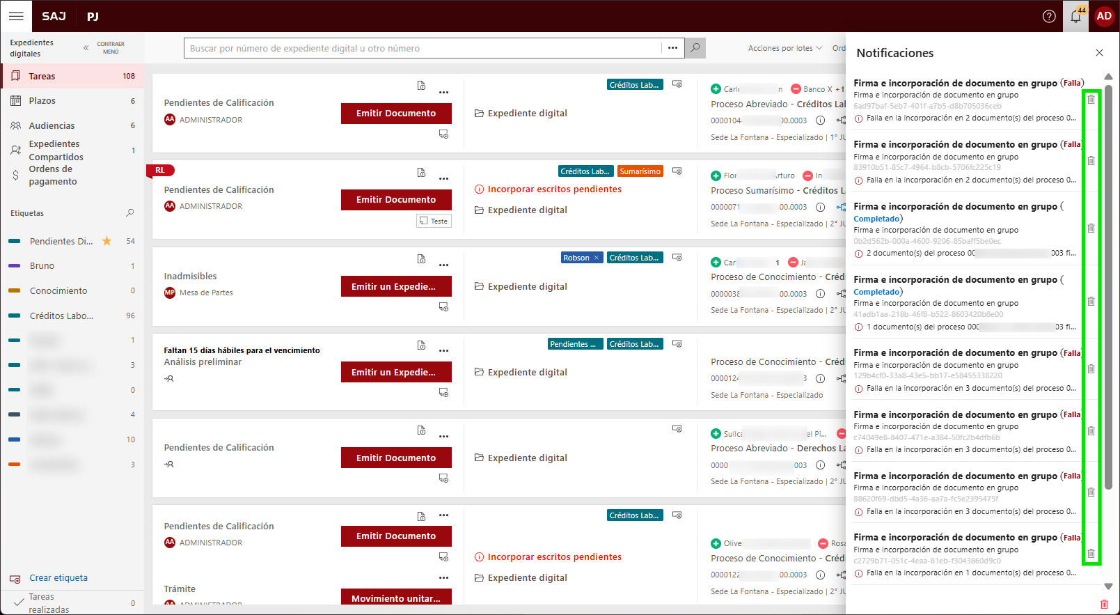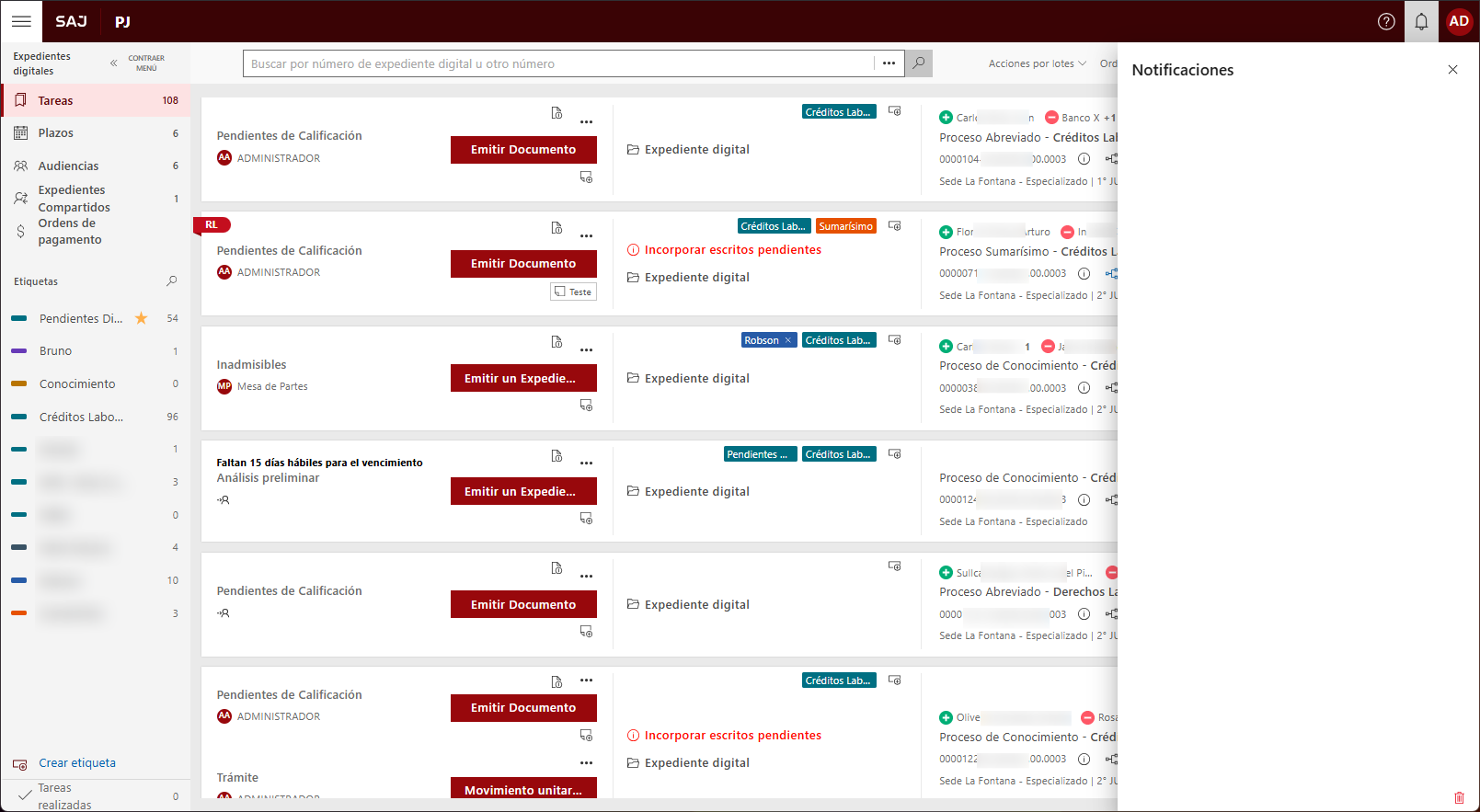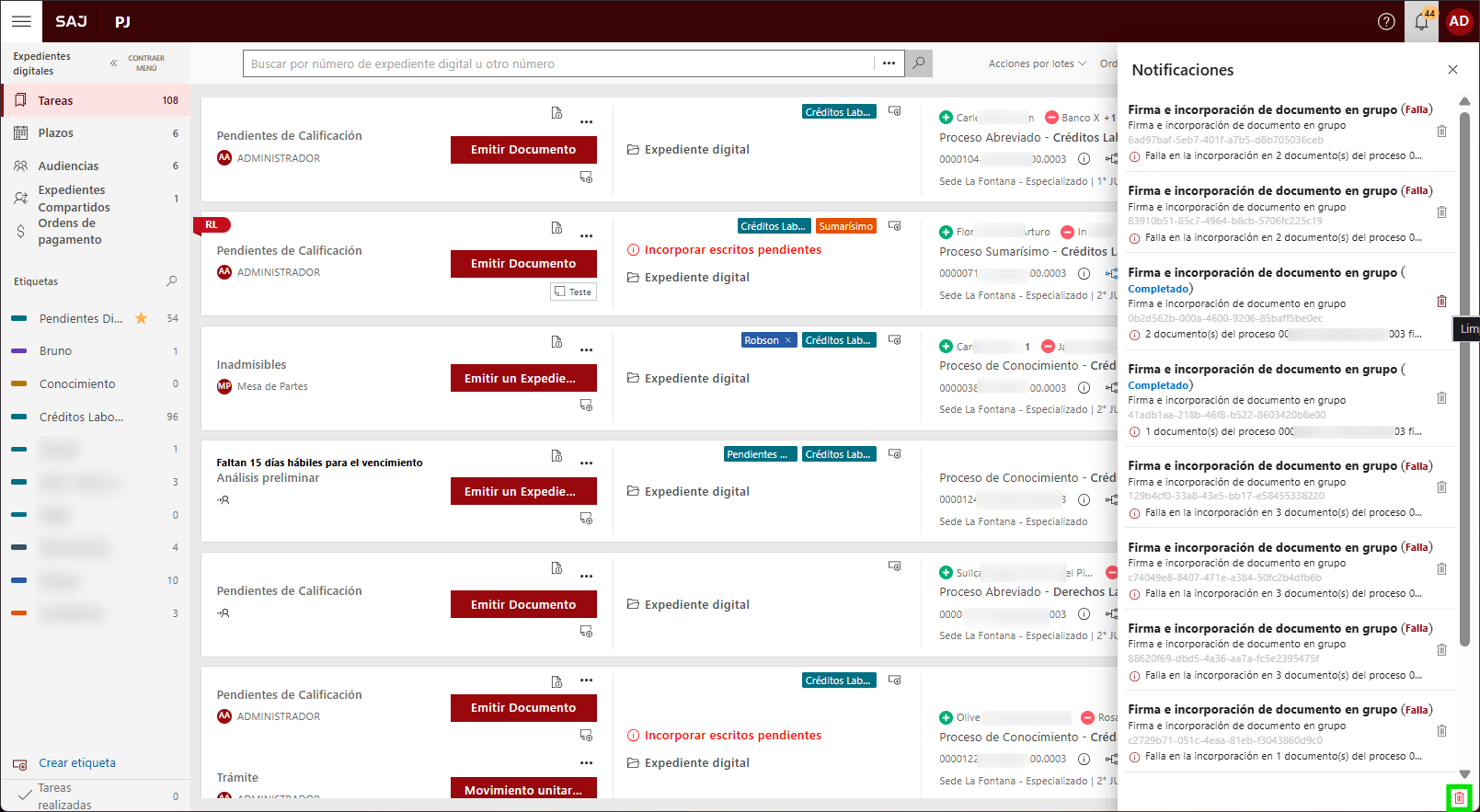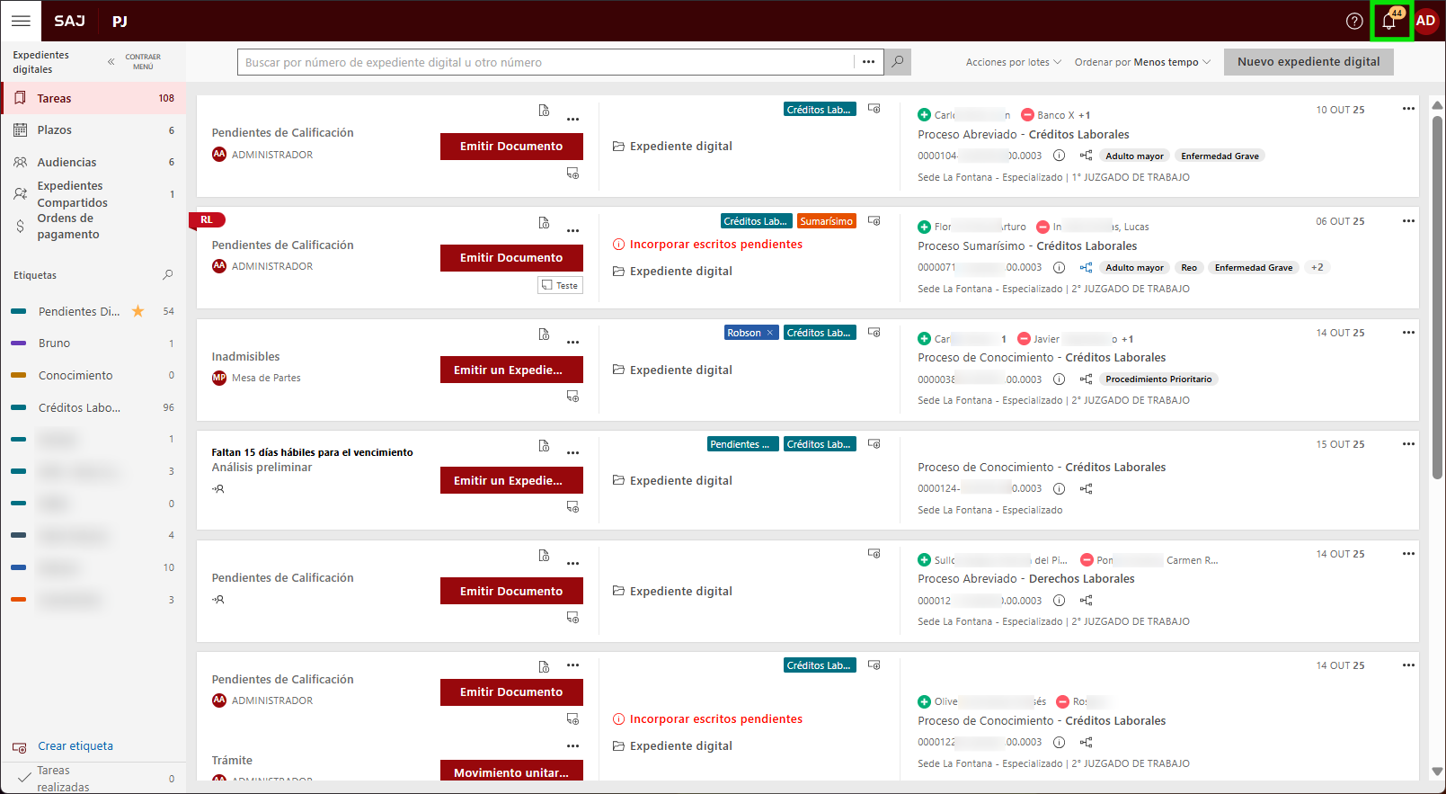 En el Panel de Tareas, haga clic en el icono de la campana. Observe la numeración presentada junto al icono, esta representa la cantidad de notificaciones que hay hasta el momento y que continuarán siendo contabilizadas hasta que sean eliminadas del sistema.