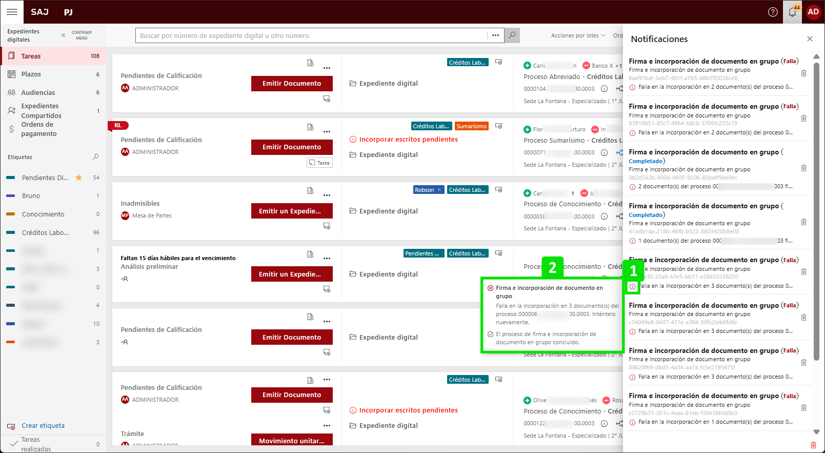 Haga clic en el icono de exclamación de la notificación deseada (1). El sistema presentará una información detallada (2) sobre su estado.