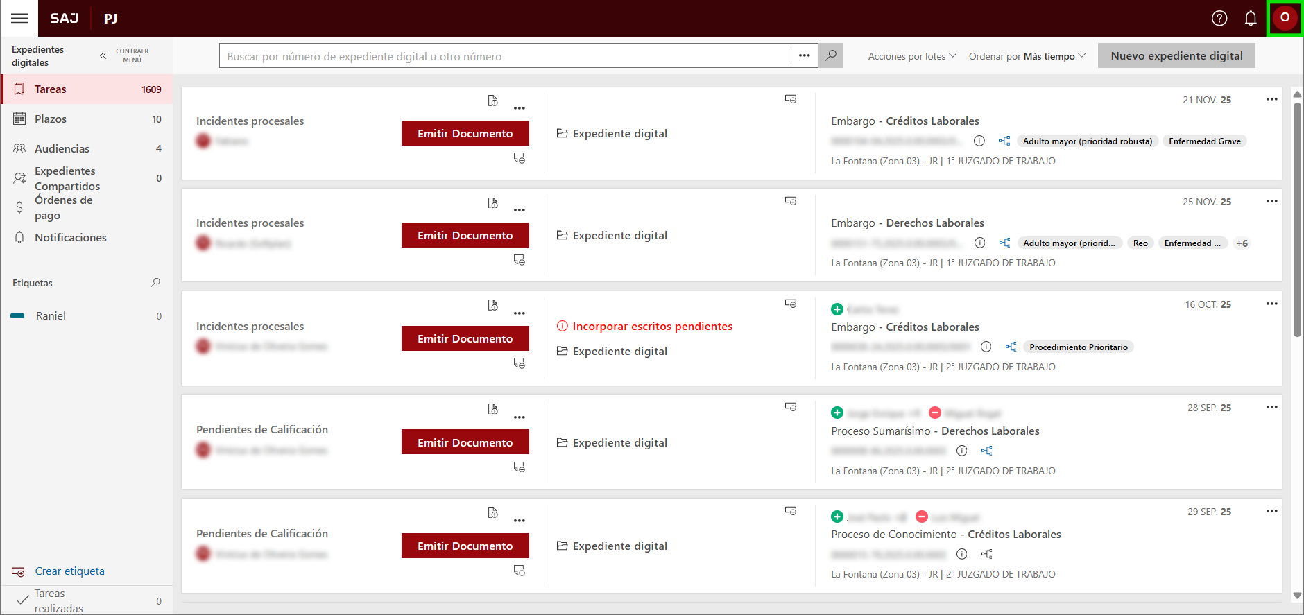 En el Panel de Tareas, haga clic en las iniciales de su usuario en la esquina superior derecha de la pantalla.