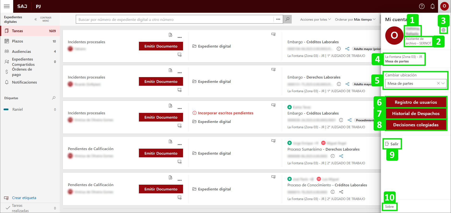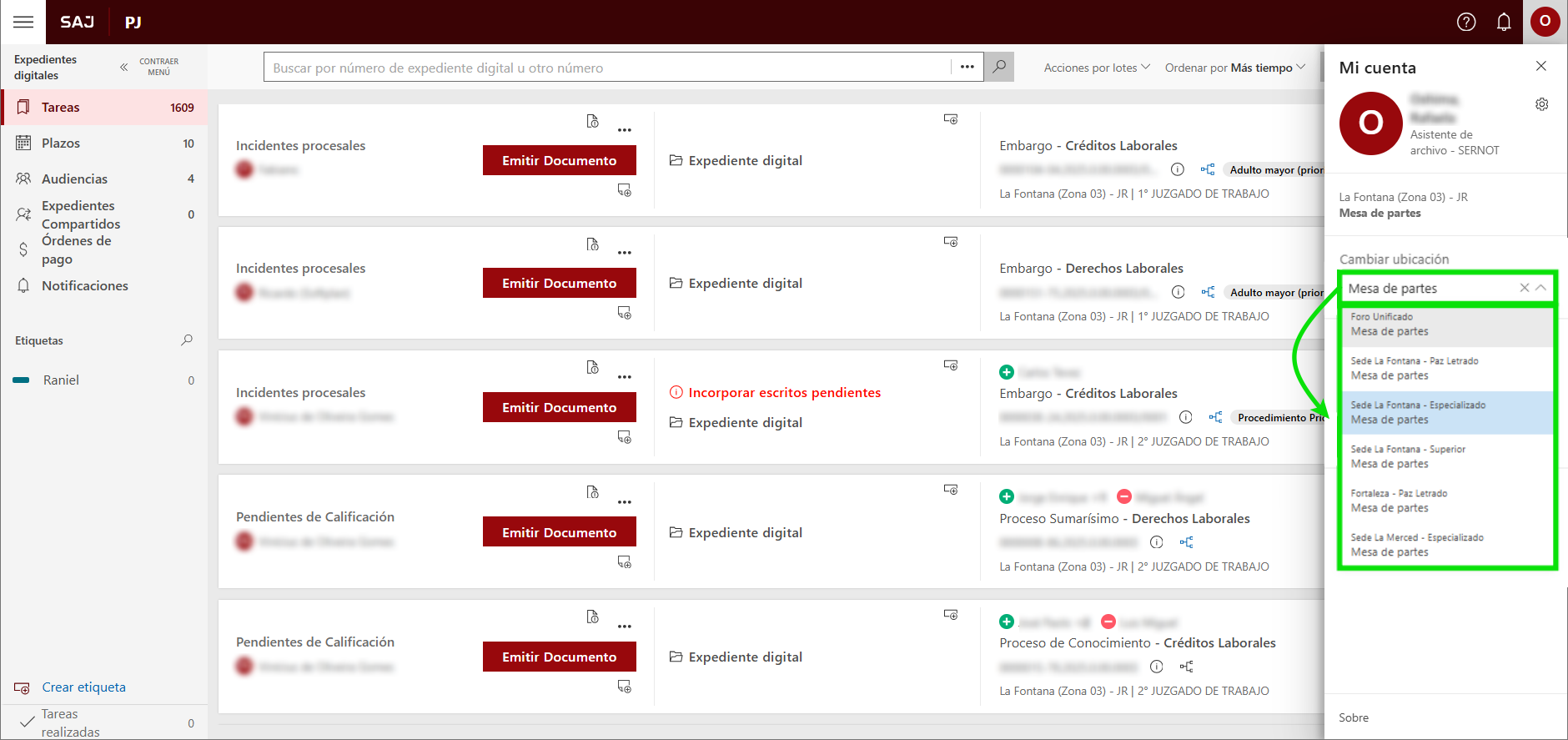 Para cambiar la ubicación de su usuario, haga clic en el campo "Cambiar ubicación" y seleccione la ubicación deseada. El sistema actualizará la ventana y recargará el panel de tareas desde la nueva ubicación seleccionada.