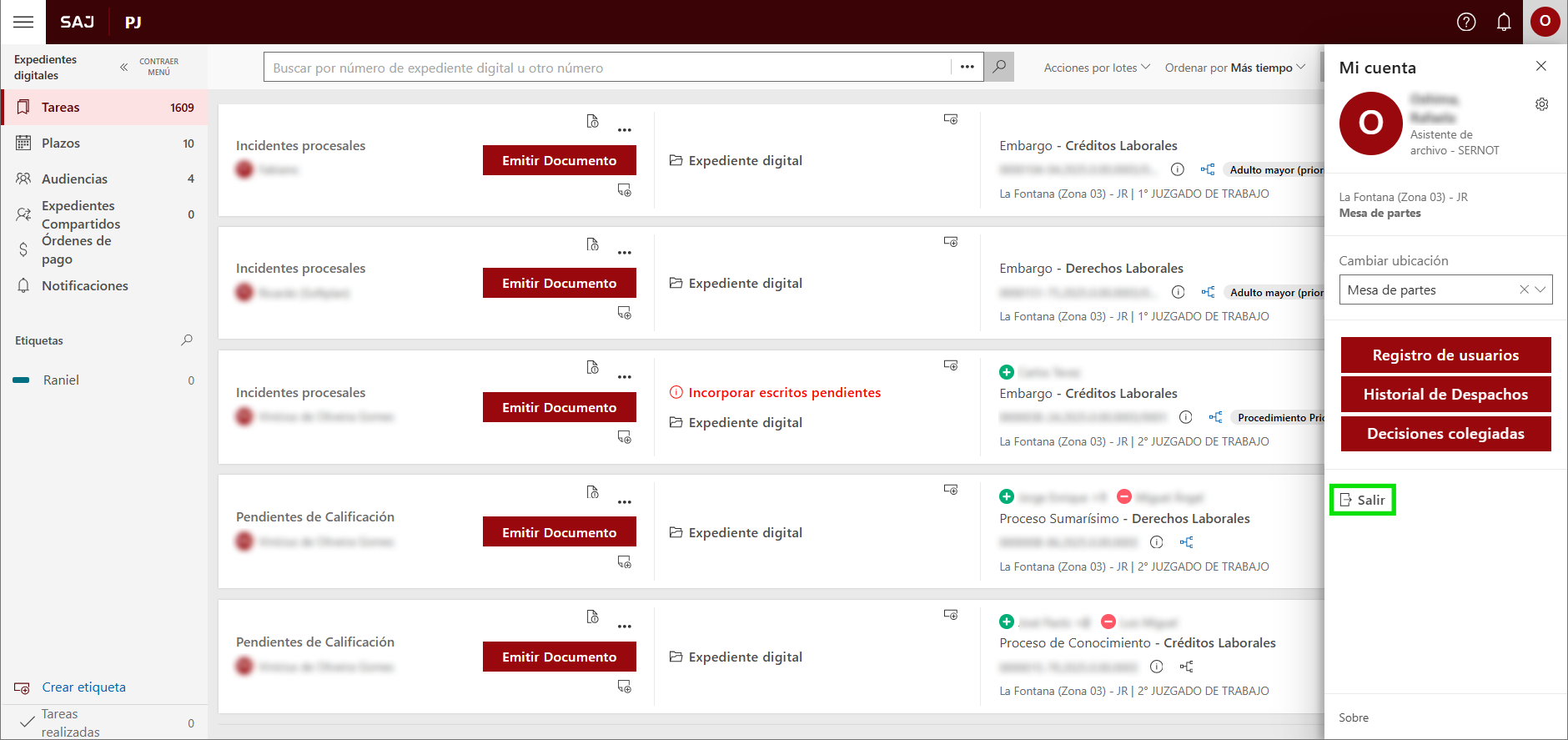 Para cerrar la sesión, haga clic en "Salir". El sistema finalizará la sesión activa y lo redirigirá a la pantalla de inicio de sesión.