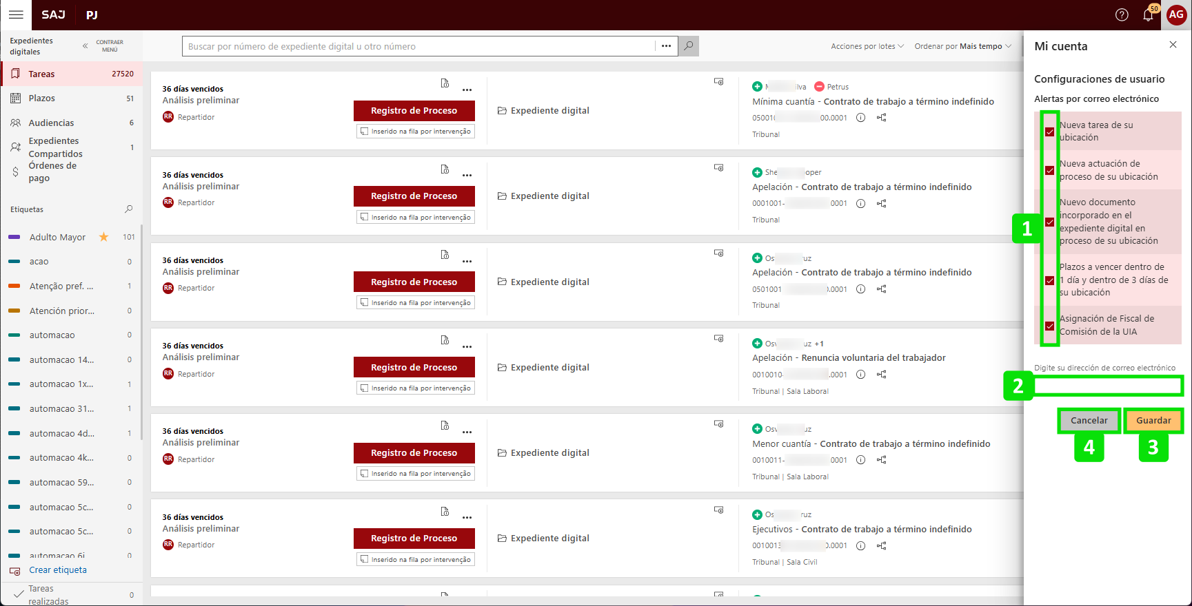 Aquí puedes ver y editar las alertas que recibes por correo electrónico y cambiar el correo vinculado a tu cuenta. En las casillas de verificación (1) desmarca las que no deseas recibir notificación vía correo electrónico. Para cambiar su correo electrónico, complete el campo (2) con el correo que desea cambiar. Para finalizar, haga clic en el botón "Guardar" (3). Por otro lado, el botón "Cancelar" (4) cerrará la ventana Configuraciones de usuario y regresa a Mi cuenta.
