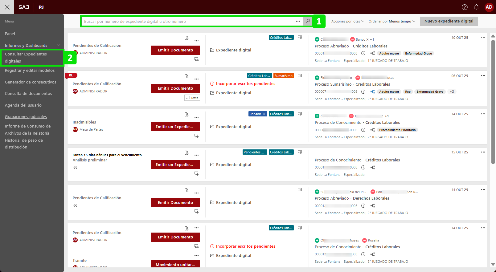 Es posible consultar los expedientes desde el Panel de Tareas, en el campo de búsqueda (1), o a través del menú "Consultar Expedientes digitales" (2).