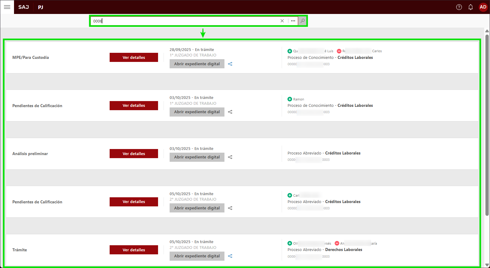 Inserte el número o parte del número del expediente en el campo de búsqueda y haga clic en el icono de lupa o presione enter en su teclado.