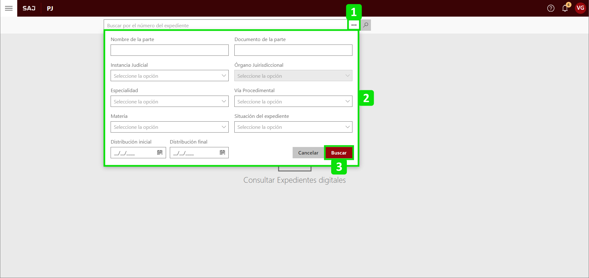 Haga clic en el icono de tres puntos (1). En la ventana de consulta avanzada, es posible insertar algunos parámetros adicionales (2) para la búsqueda. Informe los datos deseados y haga clic en el botón "Buscar" (3) para concluir la consulta. El botón "Cancelar" cierra la ventana.