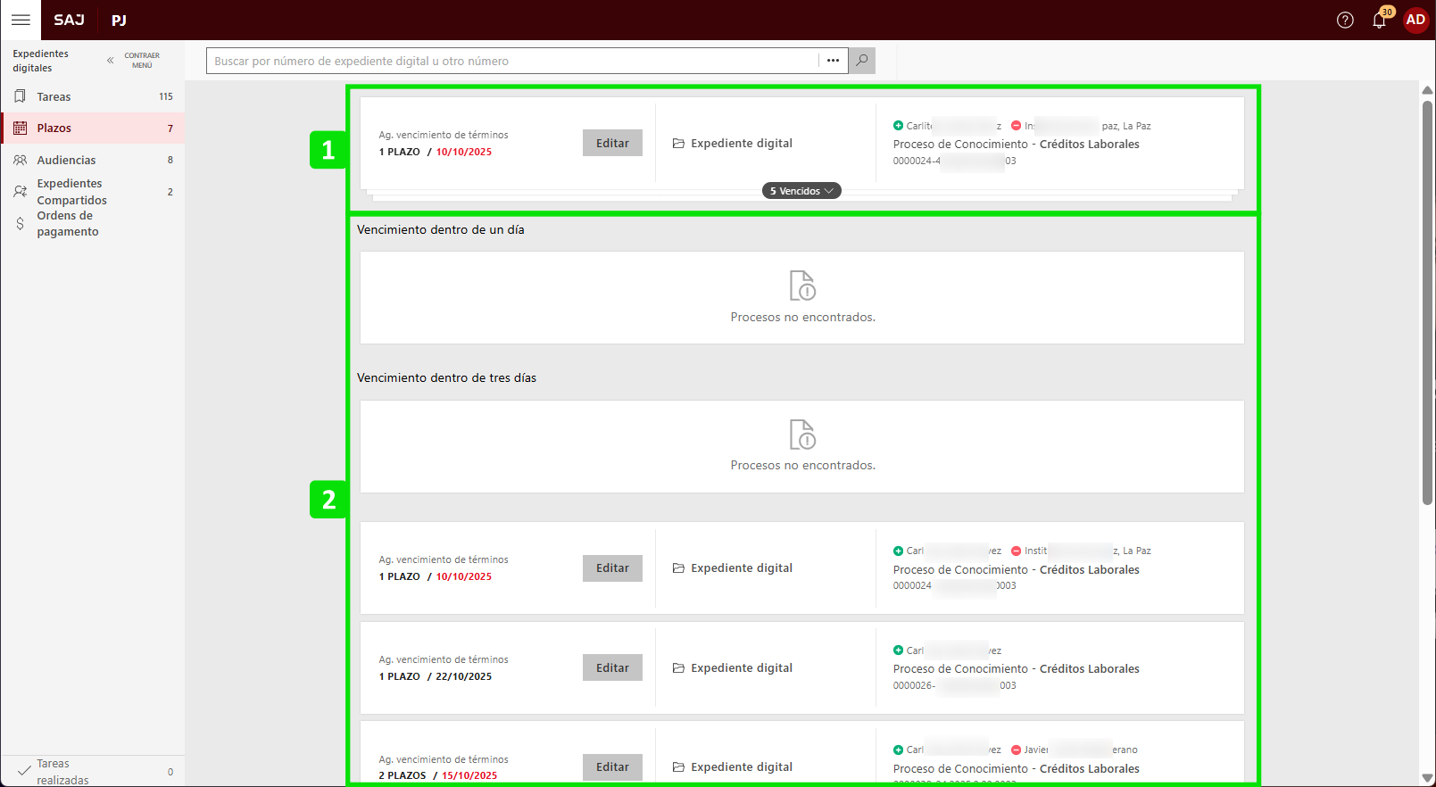 El Panel de Plazos se cargará. Los plazos son organizados por tareas en dos categorías: plazos vencidos (1) y por vencer (2).