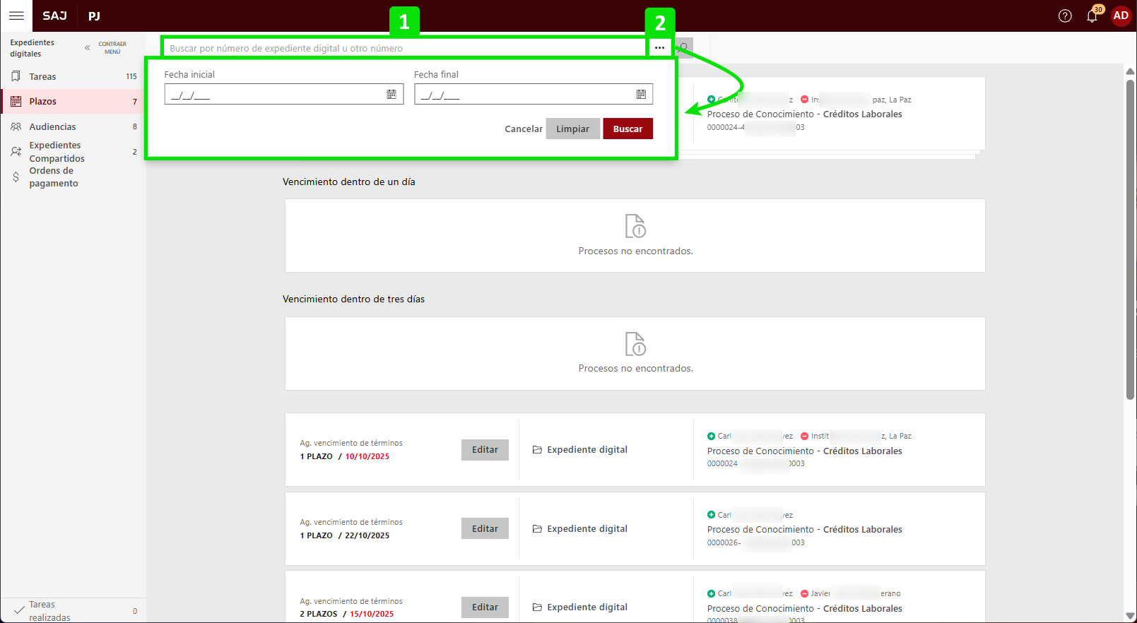 Es posible consultar plazos de expedientes específicos. En el campo de búsqueda (1), digite el número del expediente o haga clic en el icono de tres puntos (2) al lado para utilizar los filtros de búsqueda y refinar los parámetros.