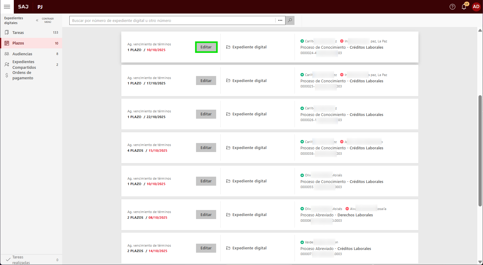 Para editar el plazo, haga clic en el botón “Editar” de la tarea deseada.