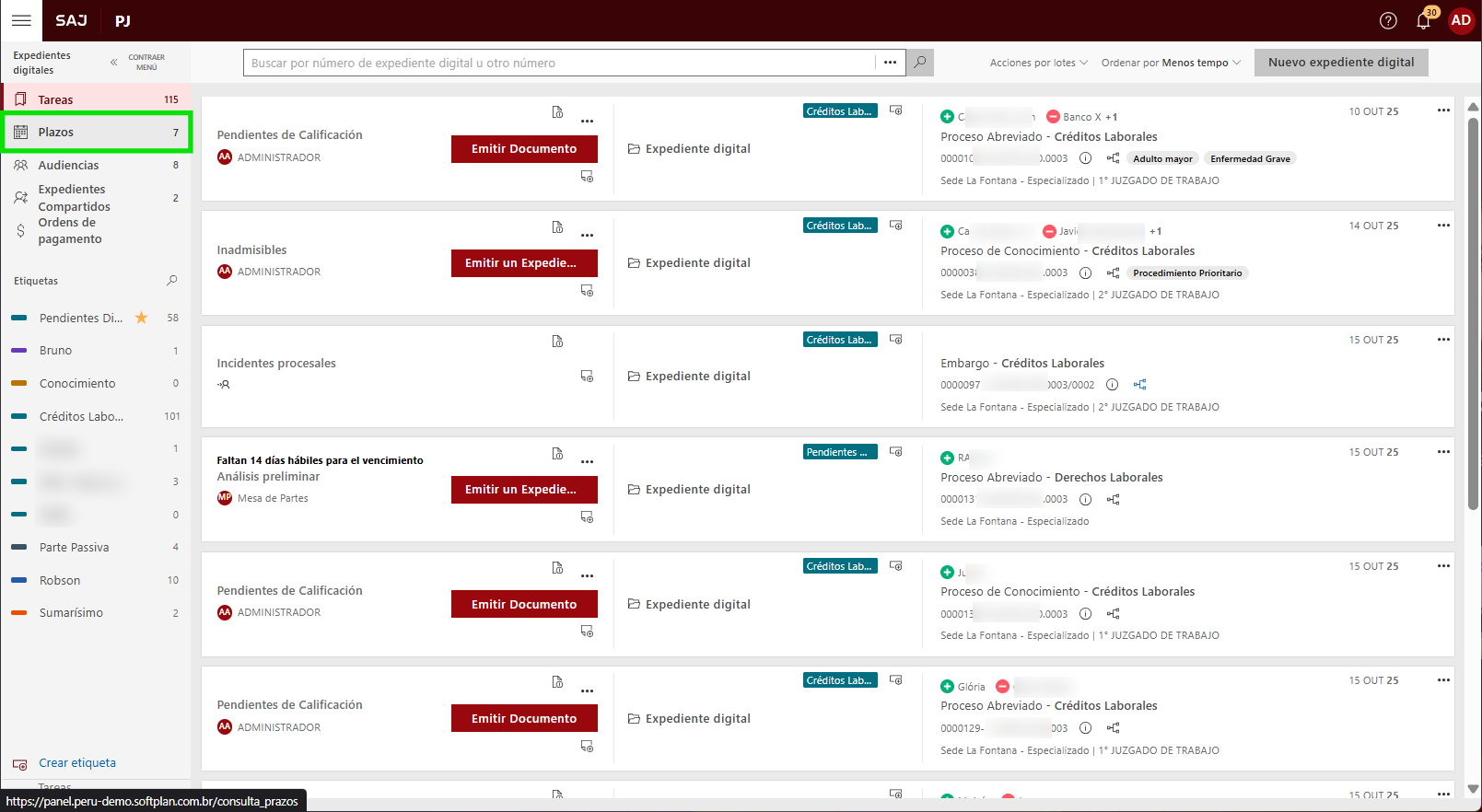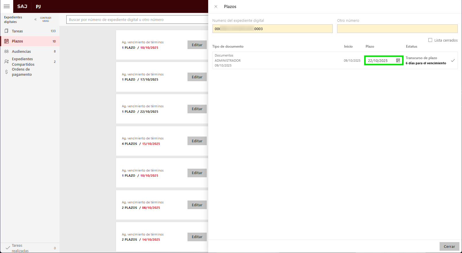 El Panel de Plazos ayuda en la gestión de actividades realizadas en los expedientes. De esta forma, es posible consultar todos los expedientes que tengan plazos pendientes (abiertos) con origen de actuación.