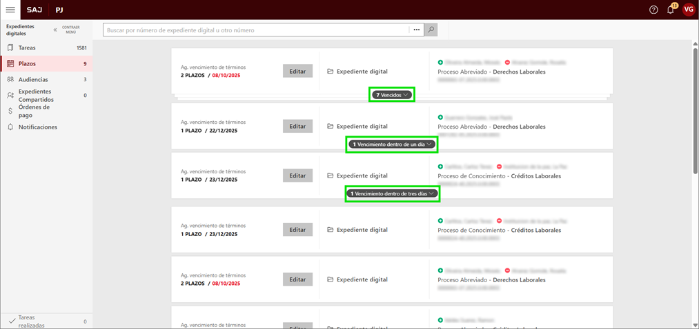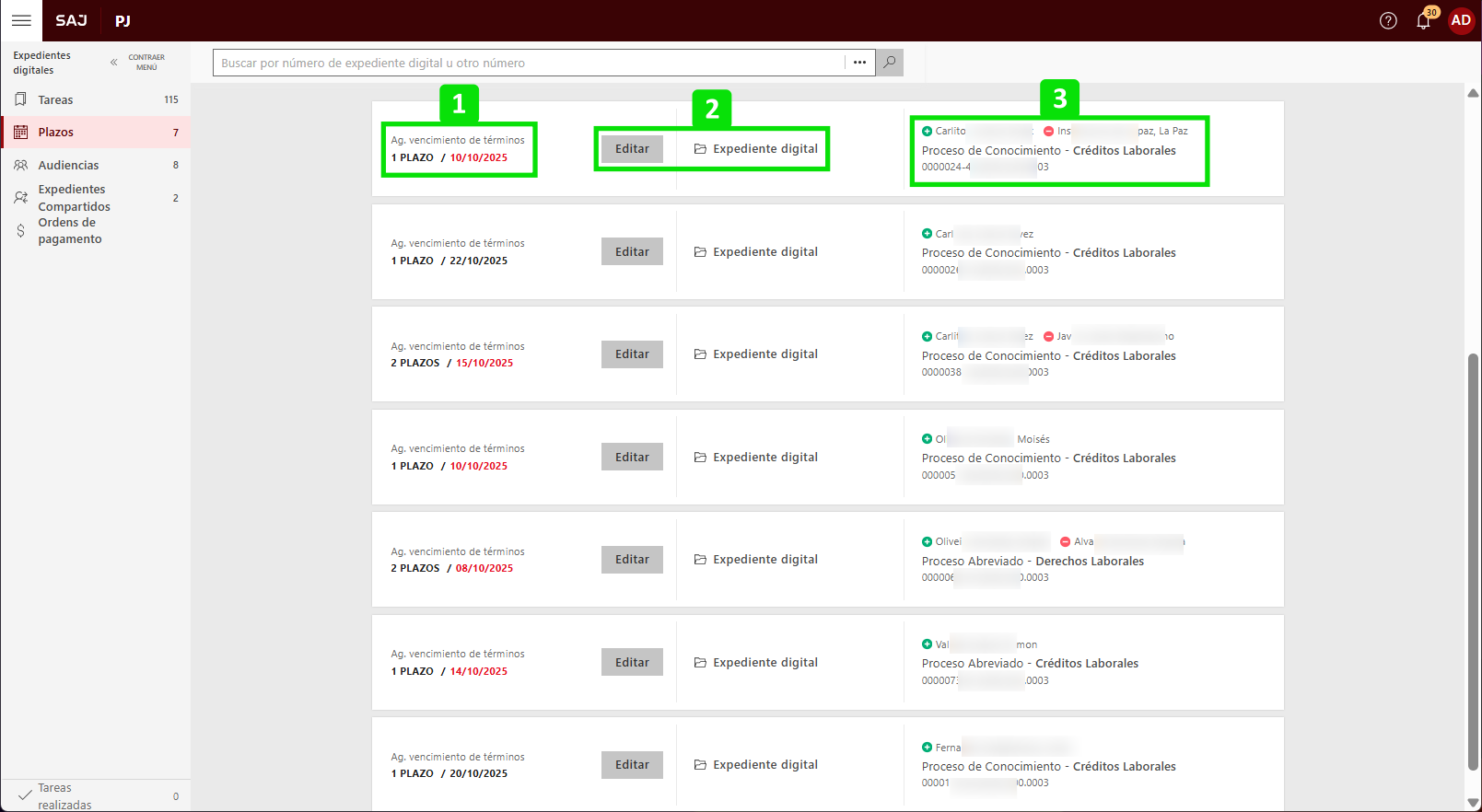 En cada tarea se presentan: el estado de la tarea, el número de plazos del expediente con su fecha de caducidad (1), las acciones "Editar" y "Expediente digital" (2) y los datos del processo (3).