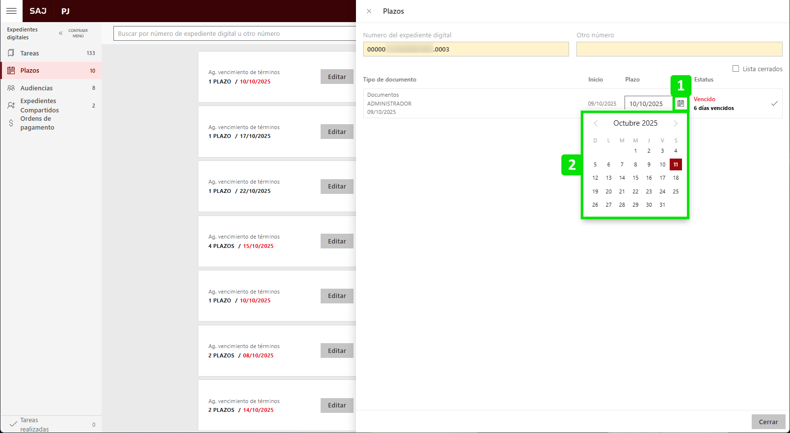En la ventana Plazos se encuentra el número del expediente al que los plazos están relacionados y sus datos. Haga clic en el calendario y seleccione una nueva fecha.