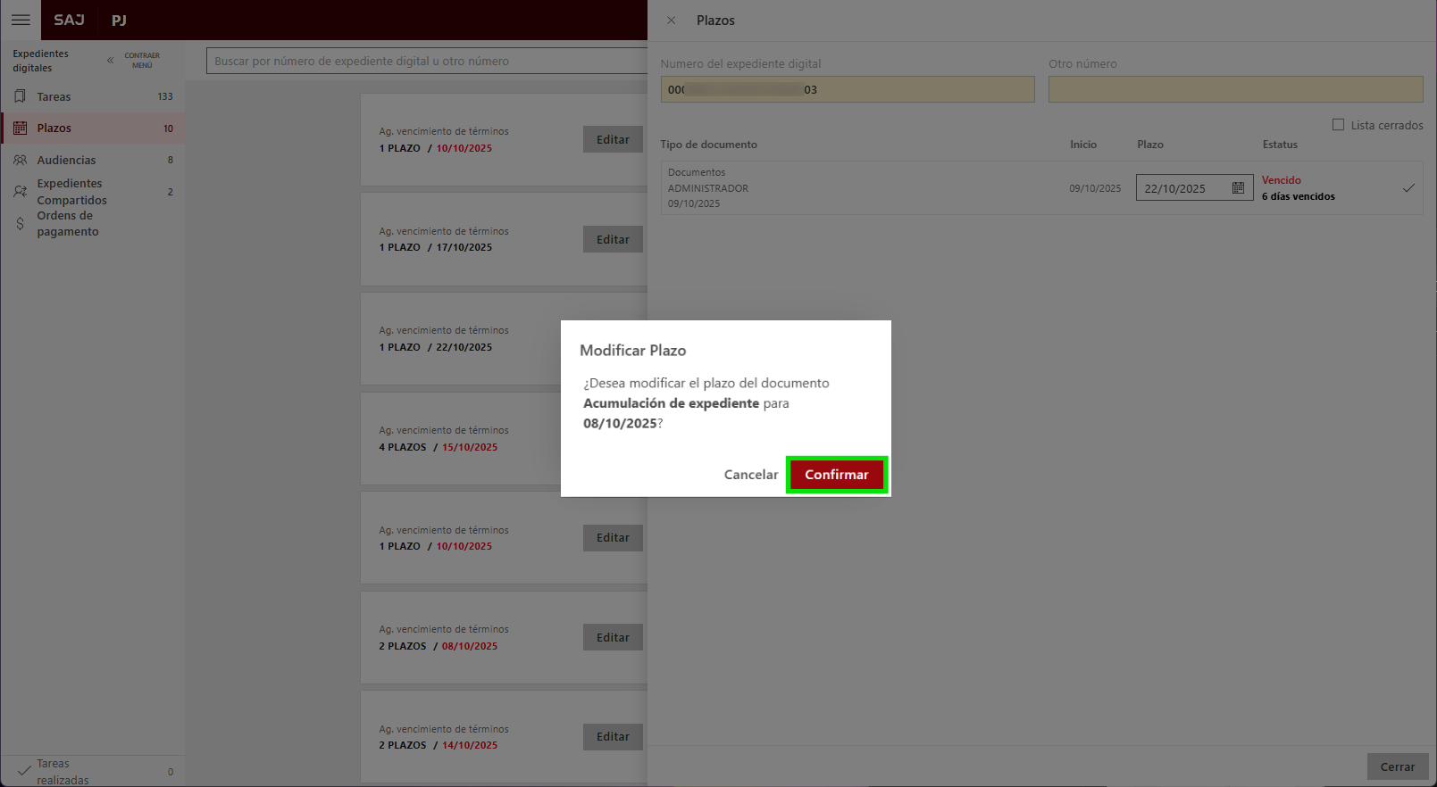 Al confirmar la modificación la nueva fecha se mostrará en el campo "Plazos".