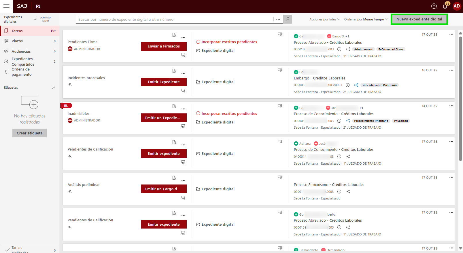 En el Panel de Tareas, haga clic en el botón "Nuevo expediente digital".