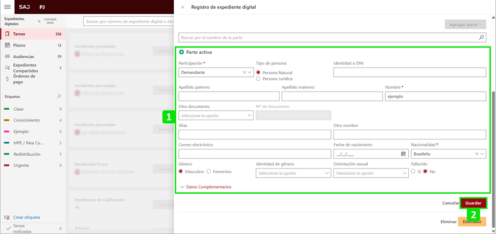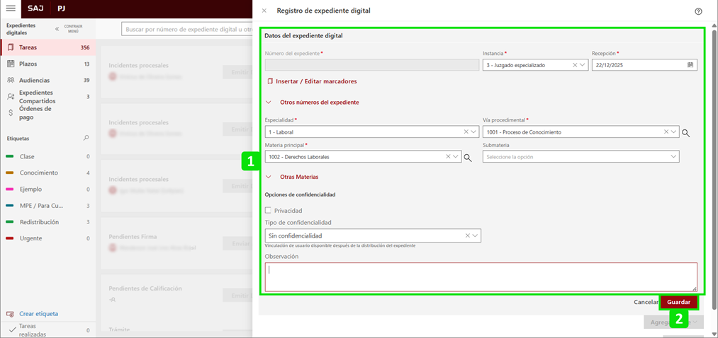 La ventana Registro de expediente digital se cargará, complete los campos (1), aquellos con asterisco rojo deben completarse obligatoriamente. Haga clic en el botón “Guardar” (2).