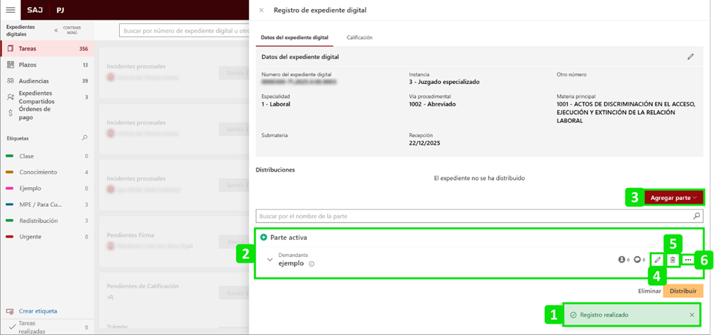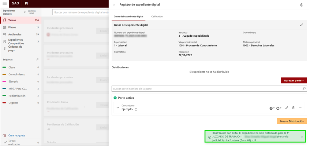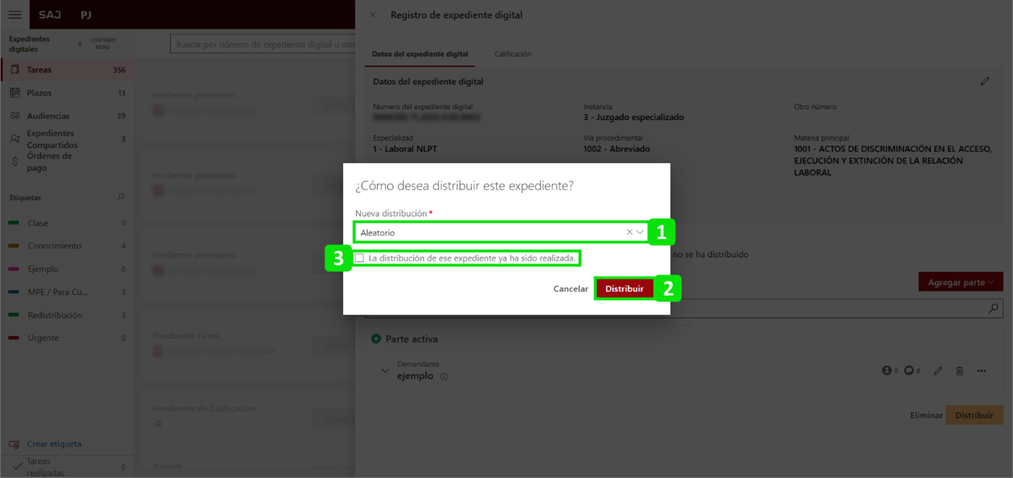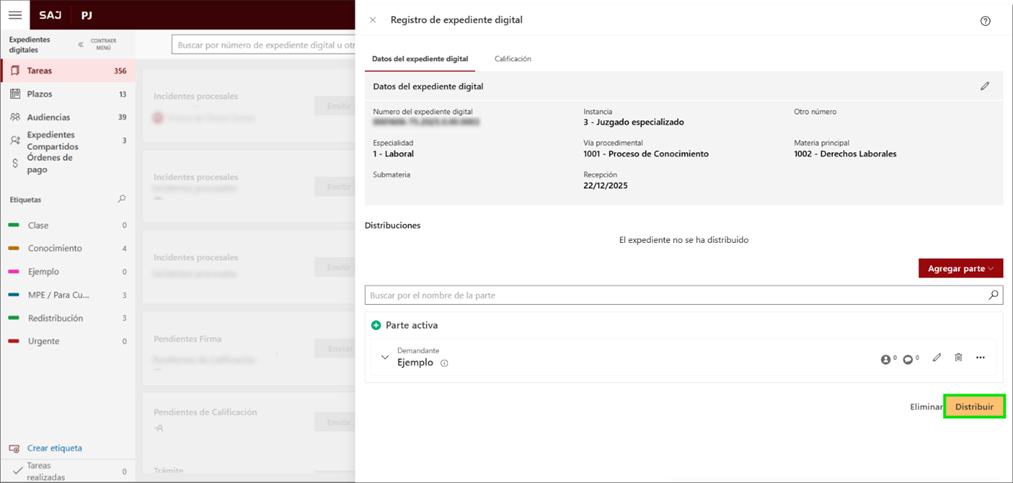 Para finalizar, haga clic en el botón “Distribuir”. El “Eliminar” cancela el registro del expediente.