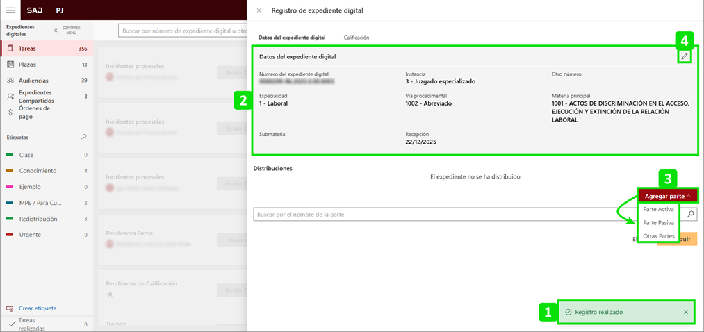 El sistema mostrará un mensaje de conclusión (1) indicando el éxito en el procedimiento realizado y los datos del nuevo expediente (2) serán visibles en la sección Datos del expediente digital. Haga clic en el botón “Agregar parte” (3) y seleccione la opción deseada.