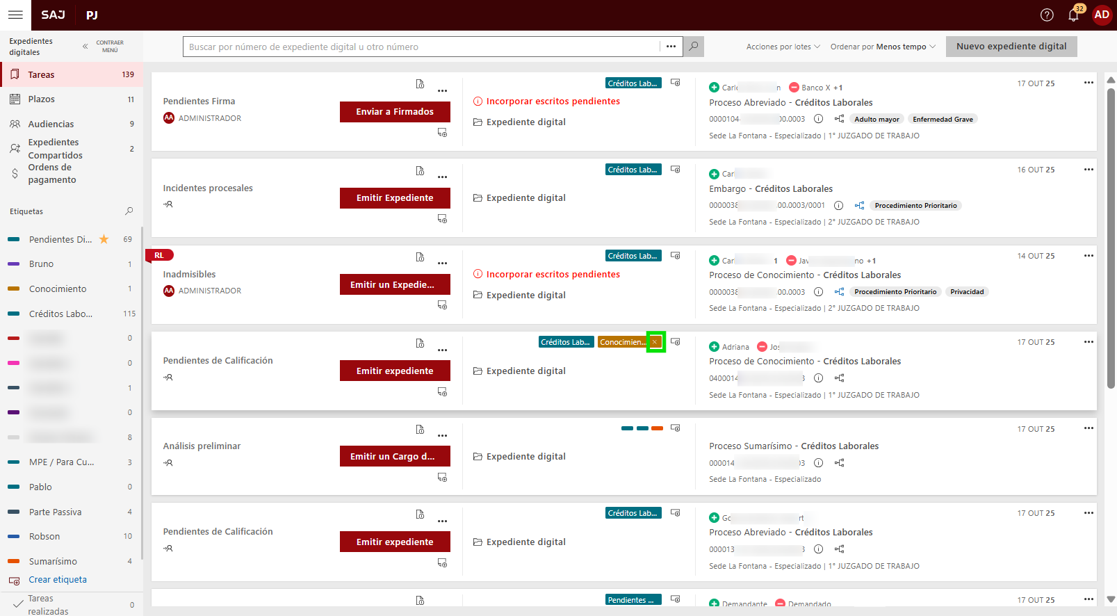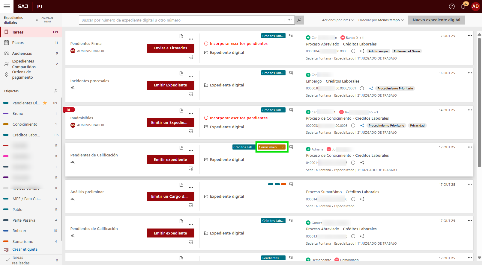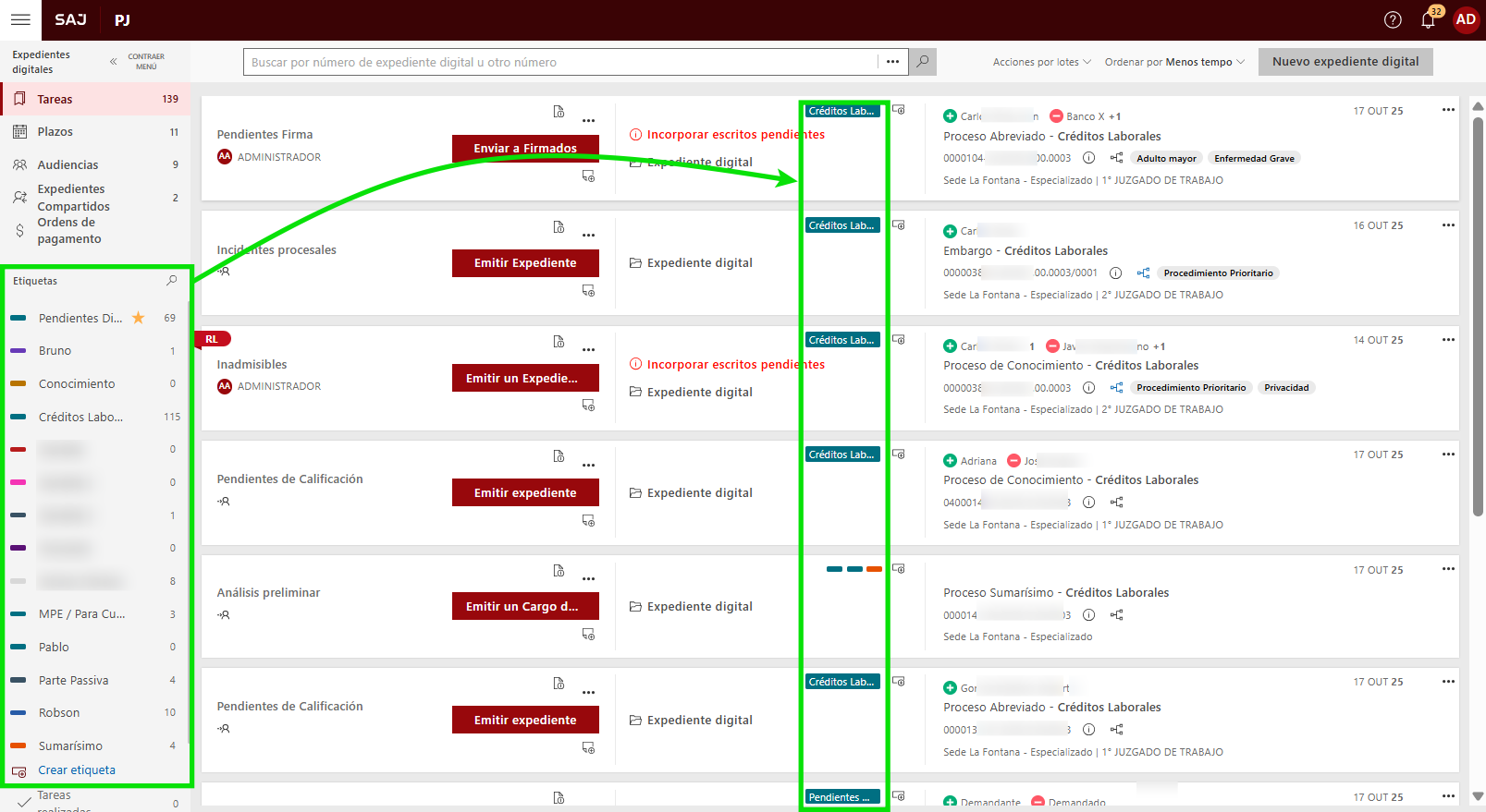 En el Panel de Tareas, haga clic en la etiqueta que desea consultar los expedientes. El sistema identificará todos los expedientes vinculados a la etiqueta seleccionada y los listará en la parte central de la pantalla.