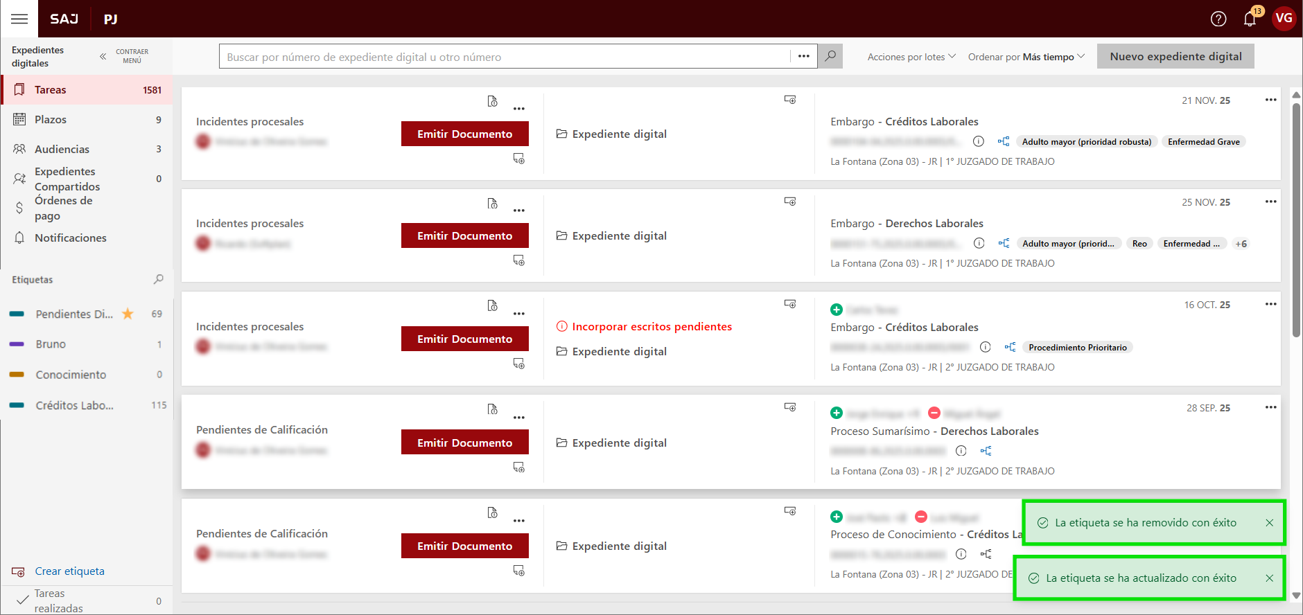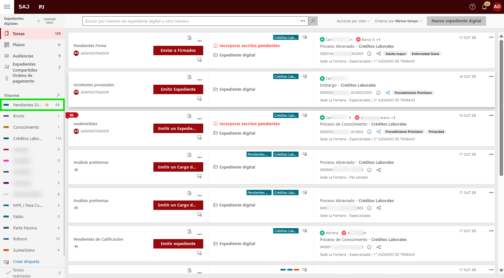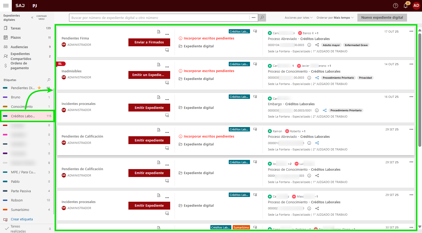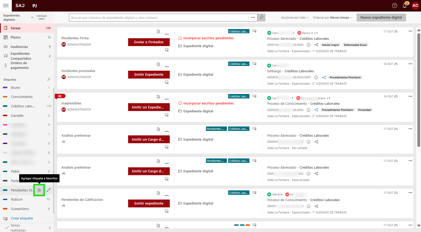 En el Panel de Tareas, haga clic en la etiqueta que desea consultar los expedientes. El sistema identificará todos los expedientes vinculados a la etiqueta seleccionada y los listará en la parte central de la pantalla.