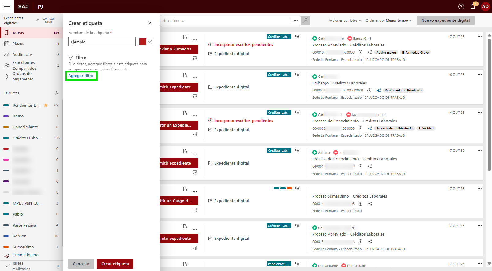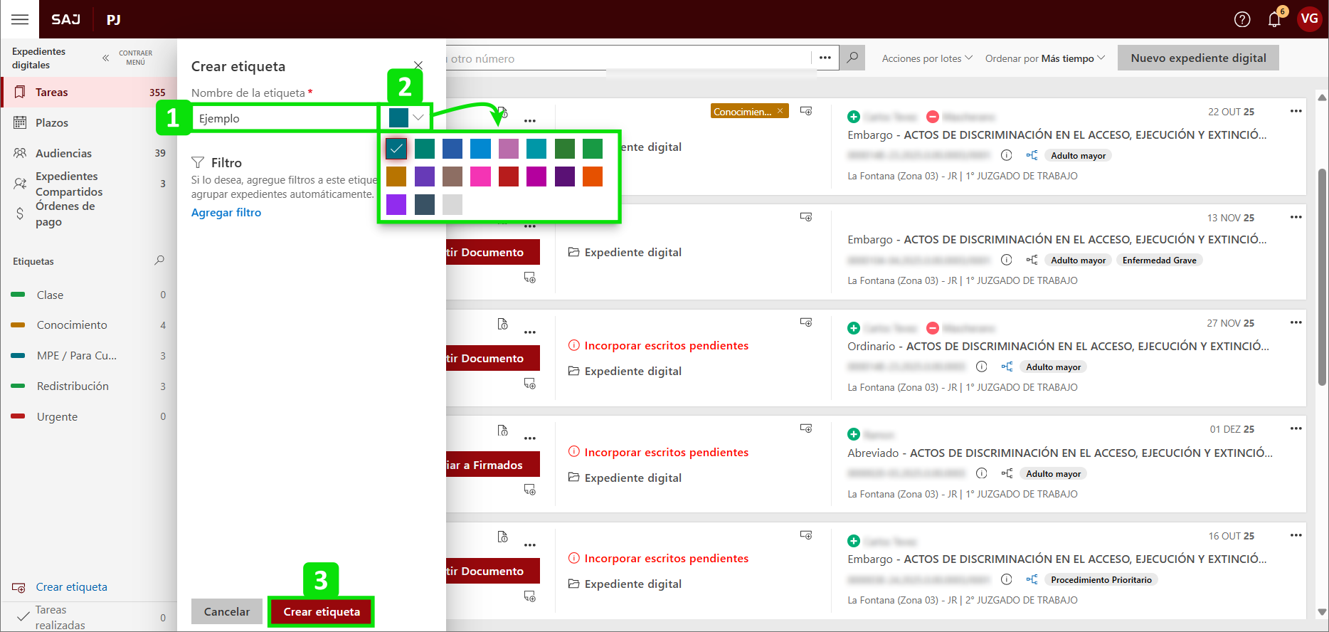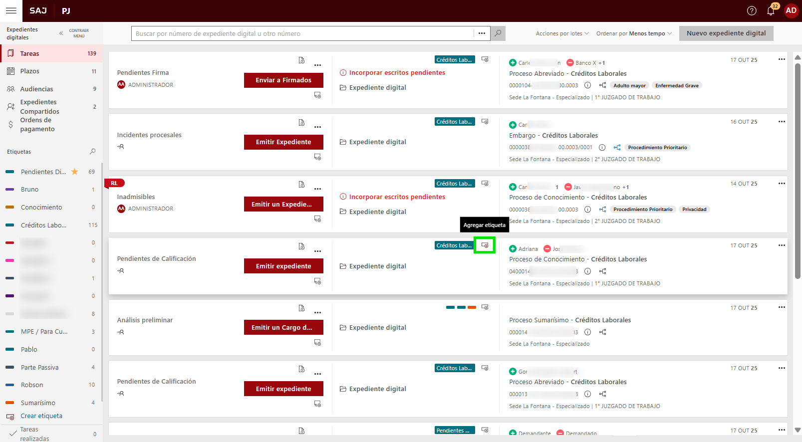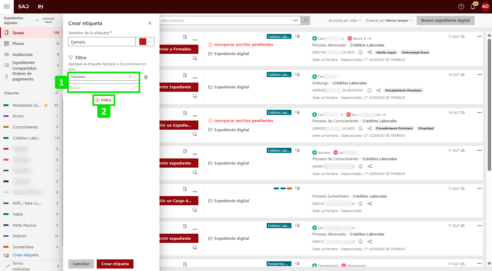 Las etiquetas ayudan con la organización y clasificación visual y en la agrupación de las tareas de los expedientes en el Panel de Tareas. Es posible crear una etiqueta para un determinado asunto, por ejemplo, homicidio; así será más fácil identificar todos los expedientes que tengan atribuida esta etiqueta.