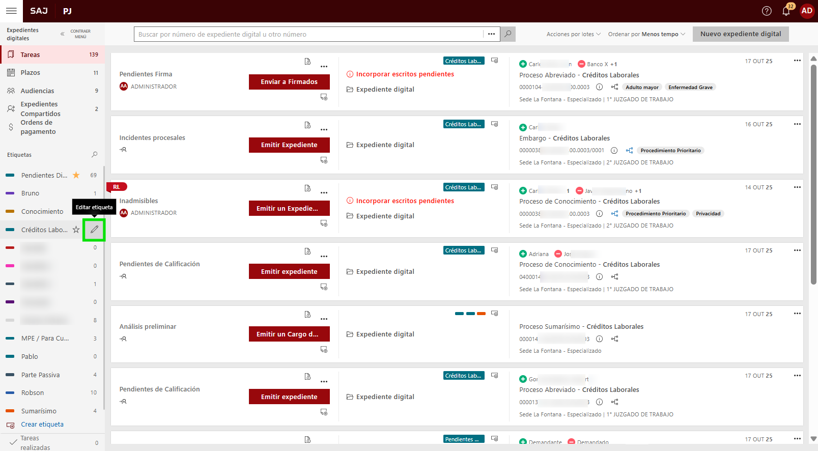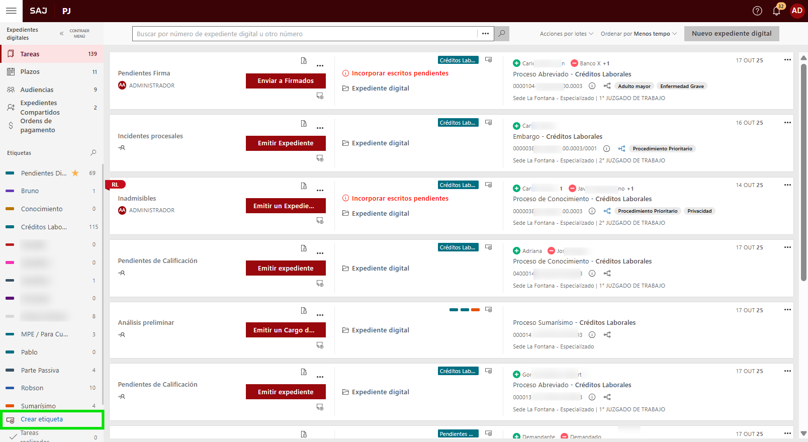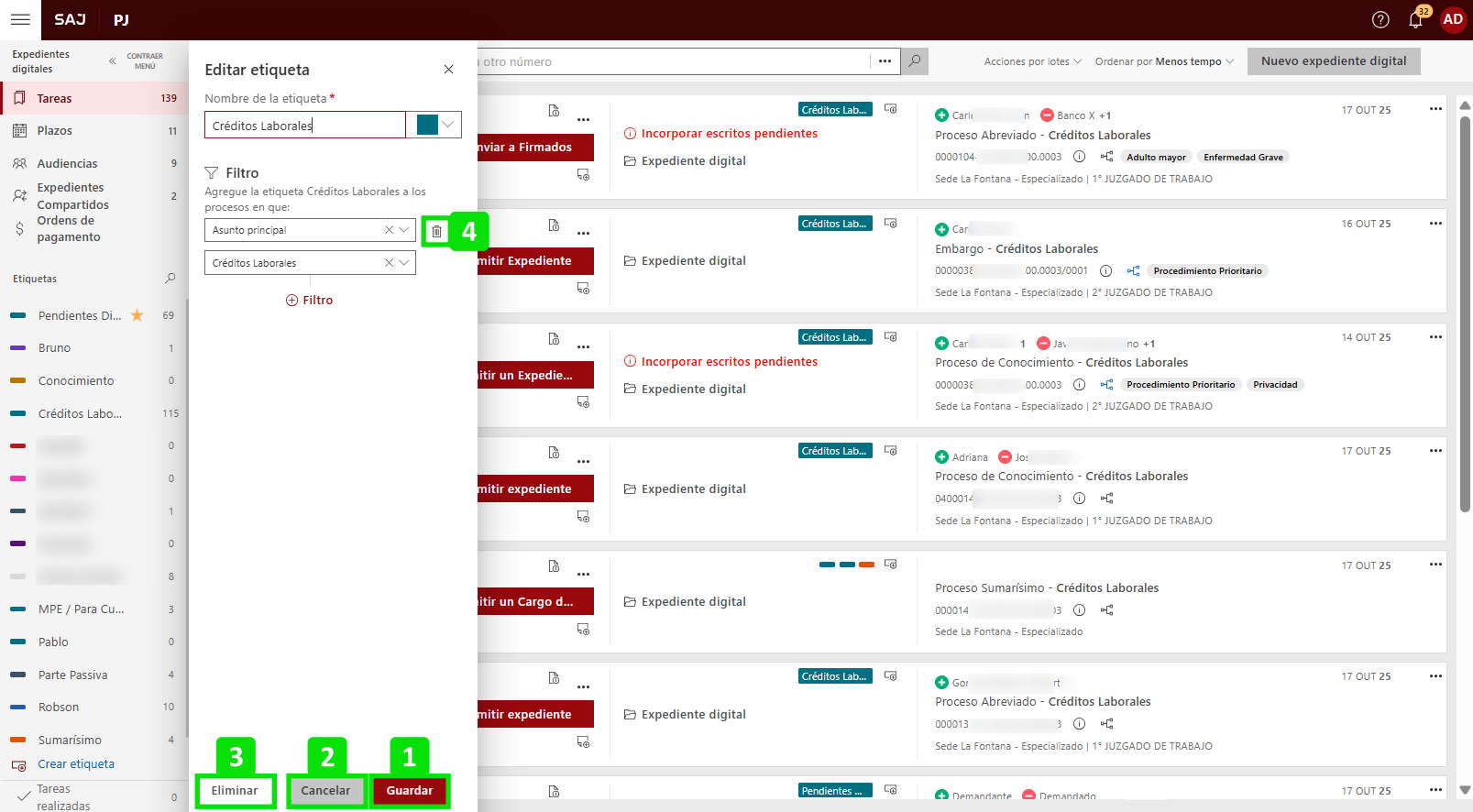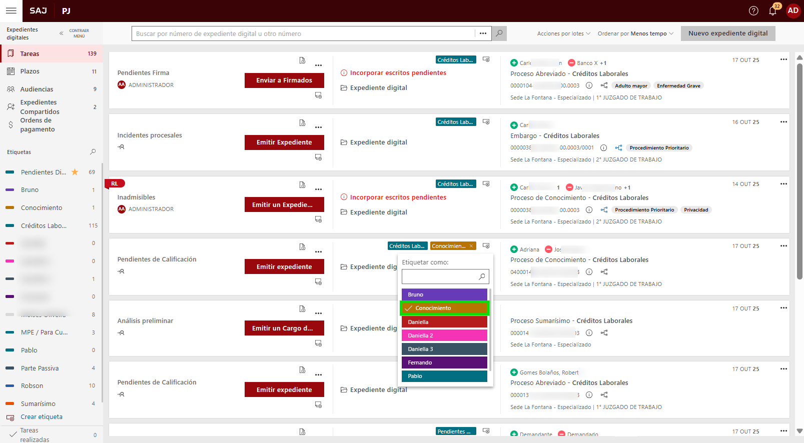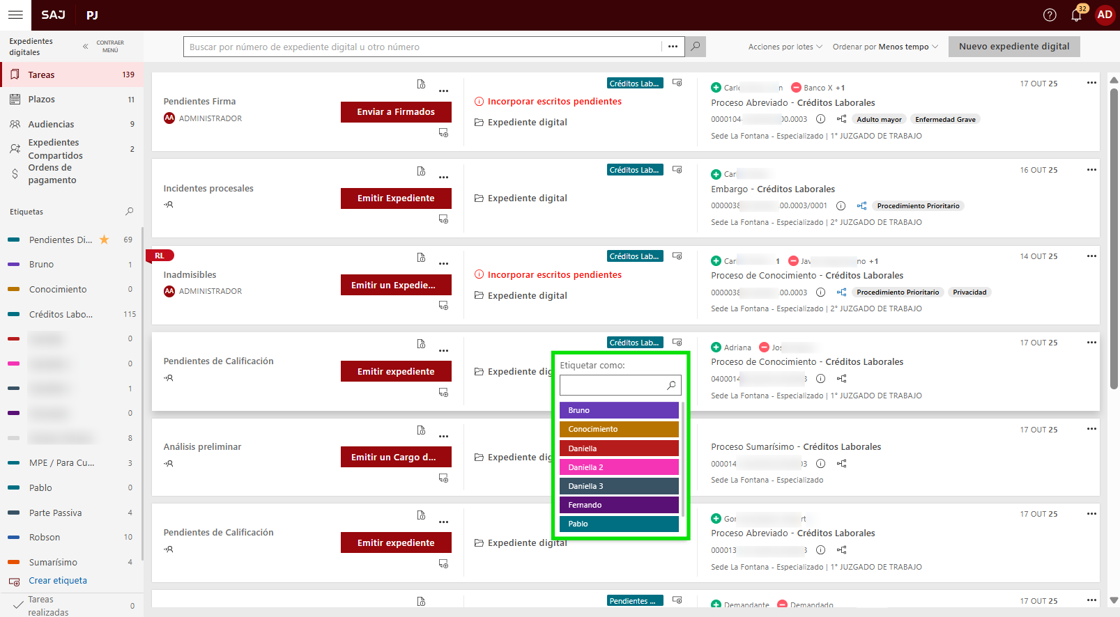 Las etiquetas ayudan con la organización y clasificación visual y en la agrupación de las tareas de los expedientes en el Panel de Tareas. Es posible crear una etiqueta para un determinado asunto, por ejemplo, homicidio; así será más fácil identificar todos los expedientes que tengan atribuida esta etiqueta.
