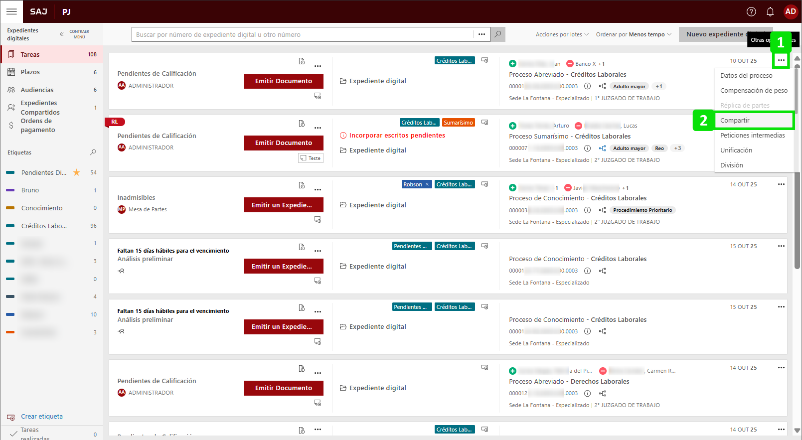 En el Panel de Tareas, haga clic en el botón "Otras operaciones" (1) de la tarea del expediente deseado y seleccione la opción "Compartir" (2).