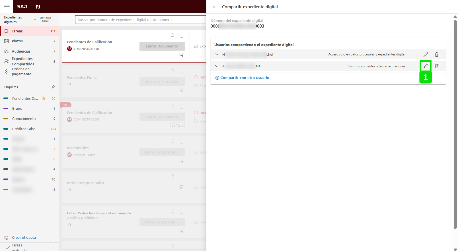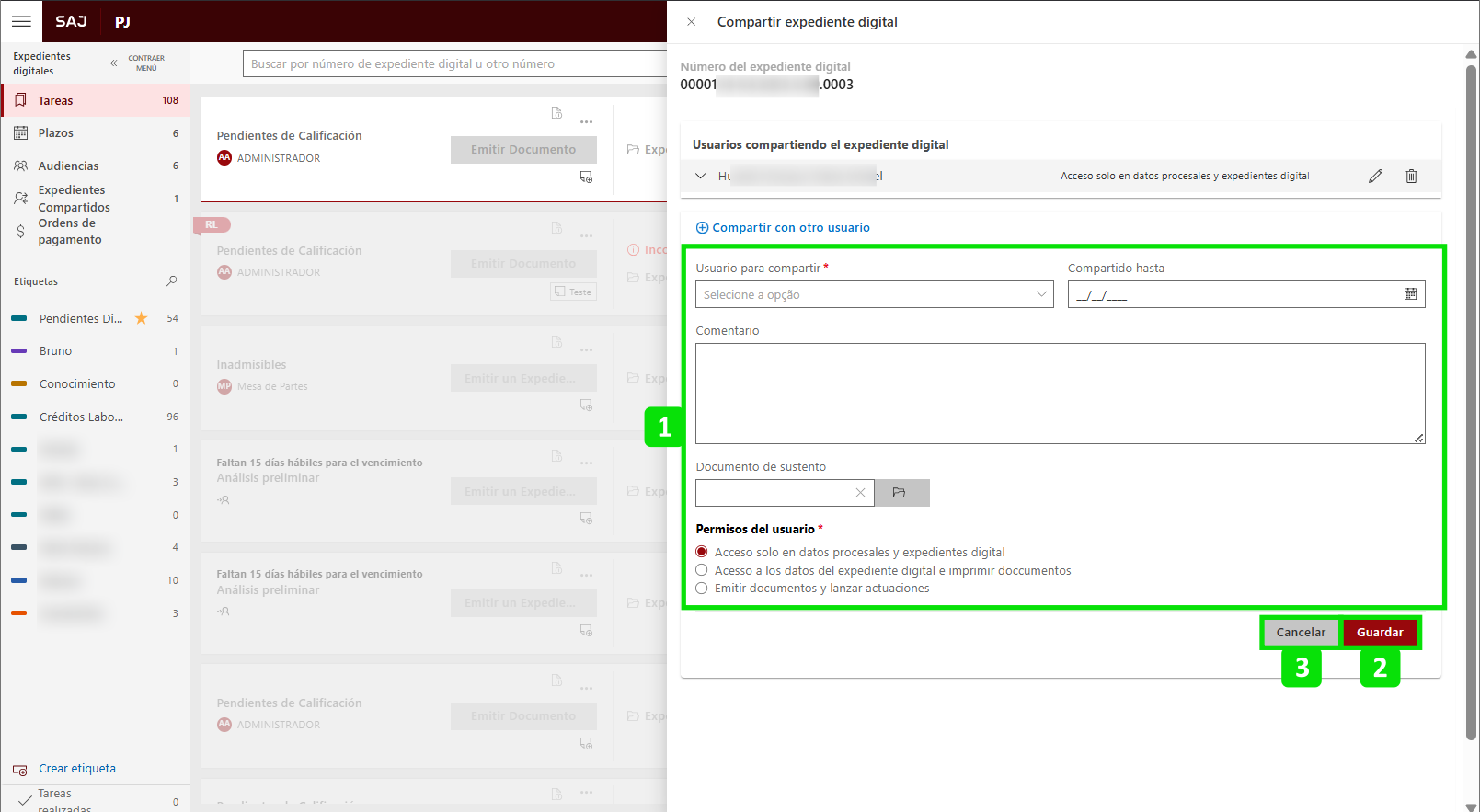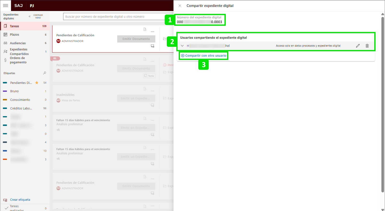 La Solución de Automatización Judicial posibilita compartir expedientes con diferentes usuarios activos en el sistema a través del Panel de expedientes compartidos.
