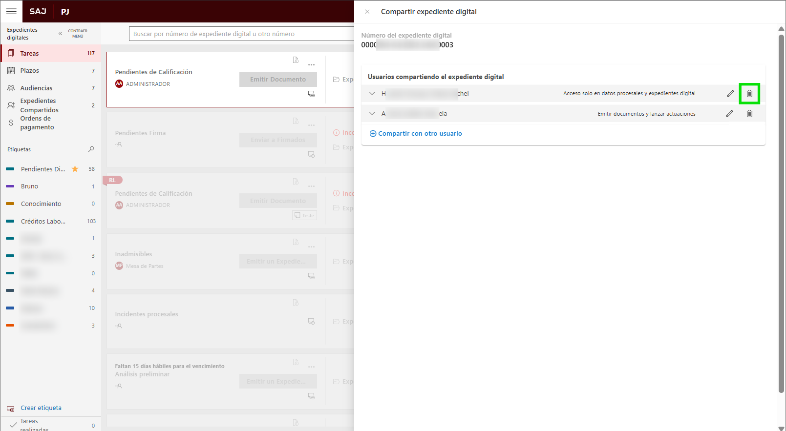 Para eliminar un usuario del expediente compartido, haga clic en el icono de la papelera del usuario deseado.