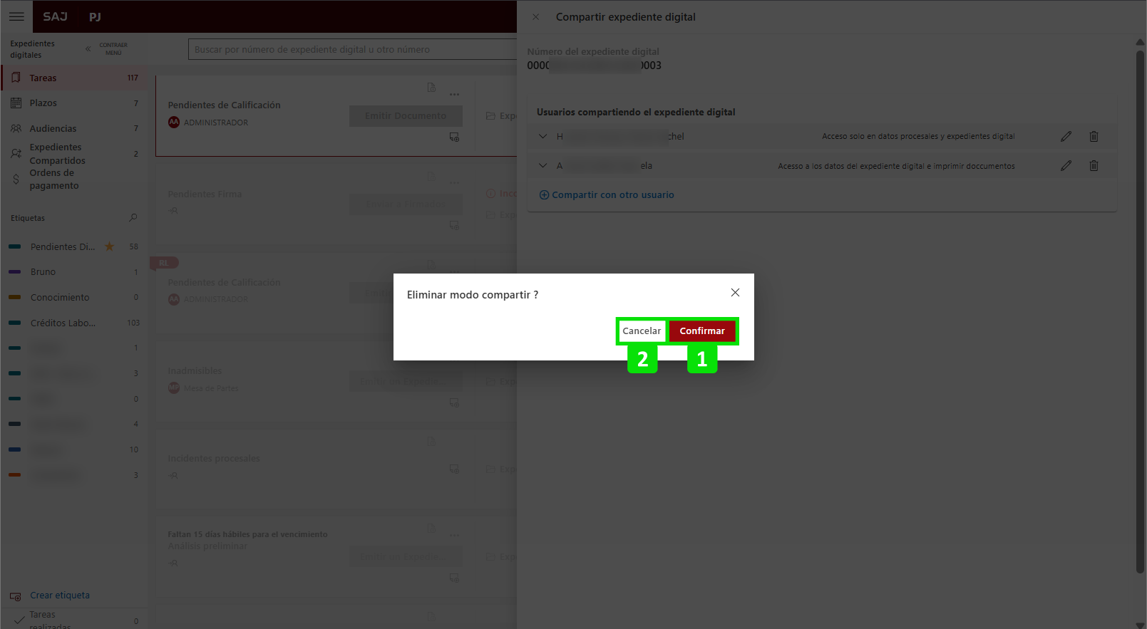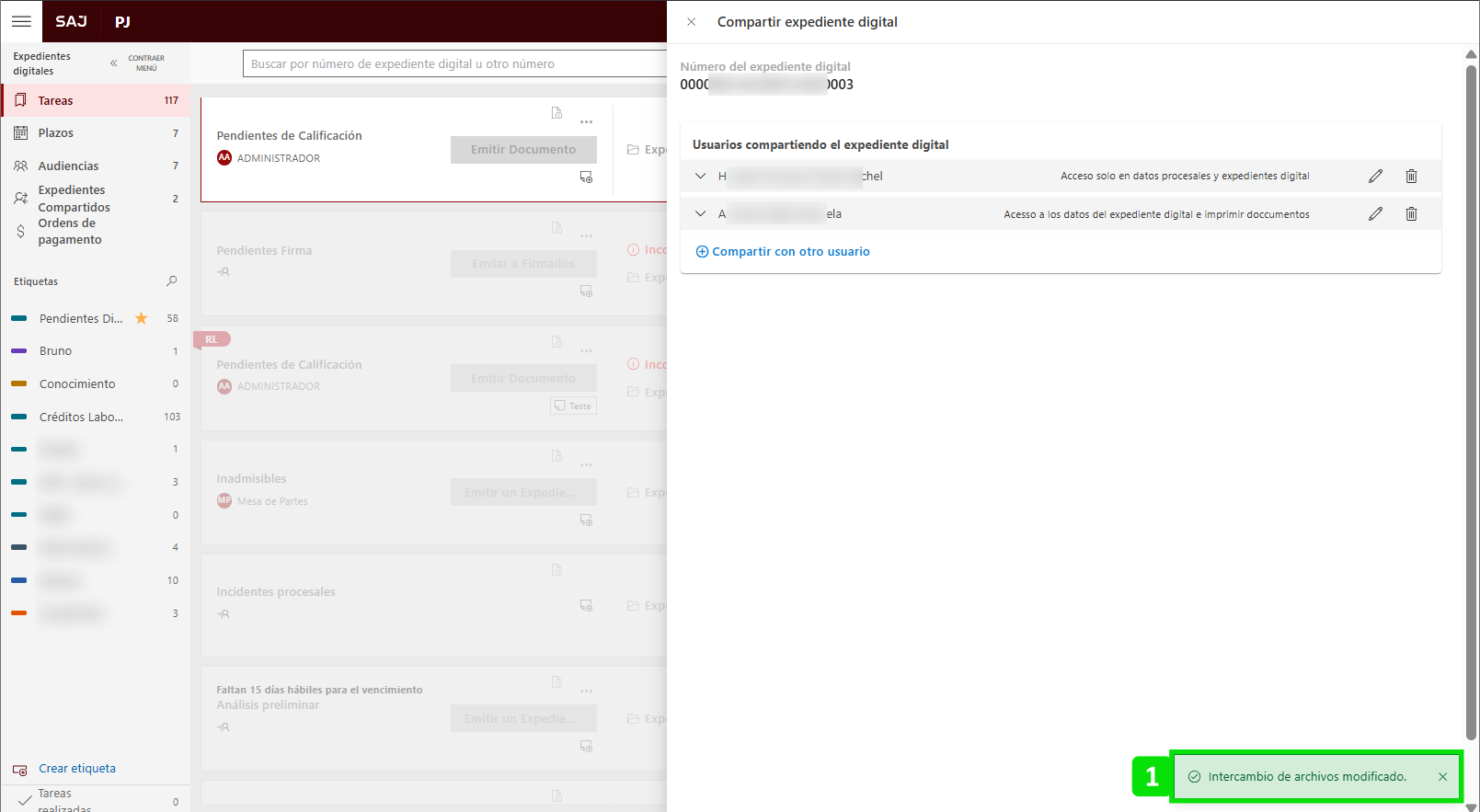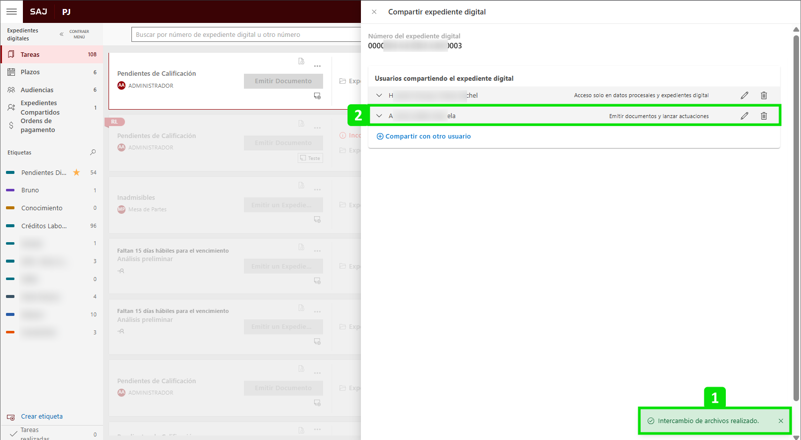 El sistema mostrará un mensaje de conclusión (1) indicando el éxito en el procedimiento realizado y en la sección "Usuarios compartiendo el expediente digital" se mostrará el usuario con el que compartiste el expediente (2).