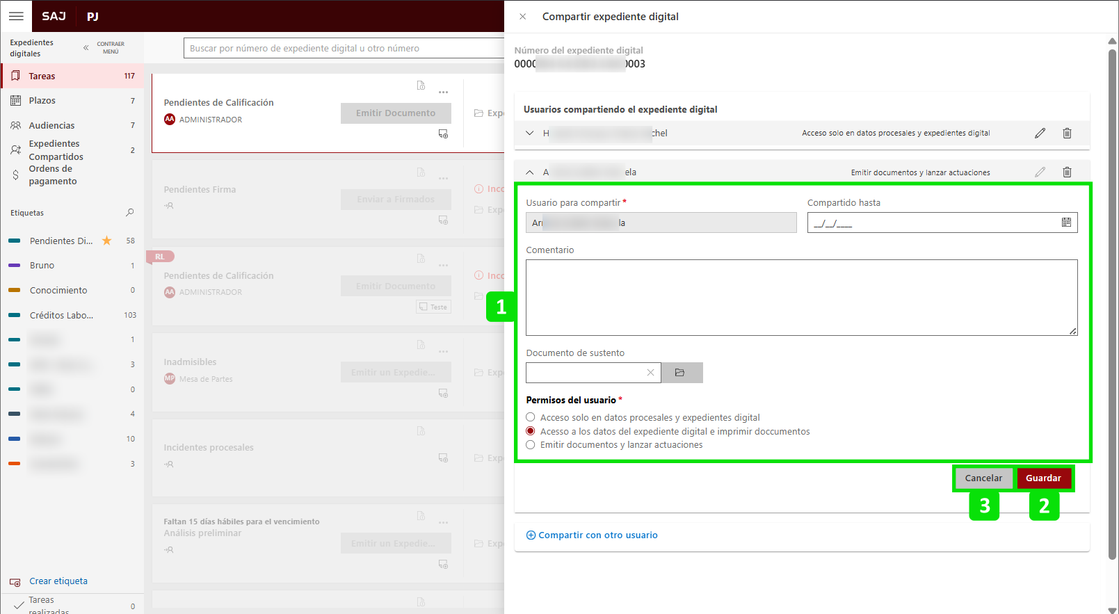 La ventana Compartir expediente digital presentará el "Número del expediente digital" (1) y, si el expediente ya fue compartido, se mostrará los nombres de los usuarios con quien fue compartido y sus permisos (2). Para compartir el expediente con un usuario, haga clic en "Compartir con otro usuario" (3).