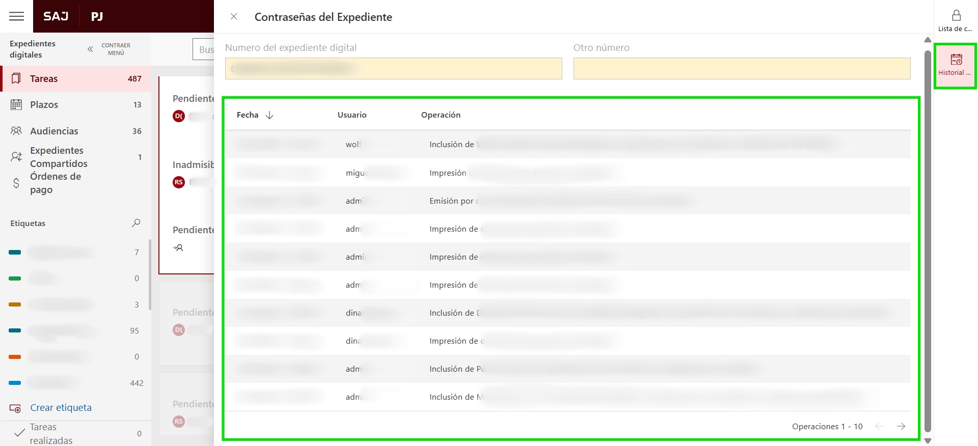 Haga clic en la pestaña Historial de operaciones para ver los registros de las actividades realizadas en la pestaña “Lista de Contraseñas del expediente”. Aquí, se visualiza la información como fecha, usuario que realizó la actividad y detalles de la operación.