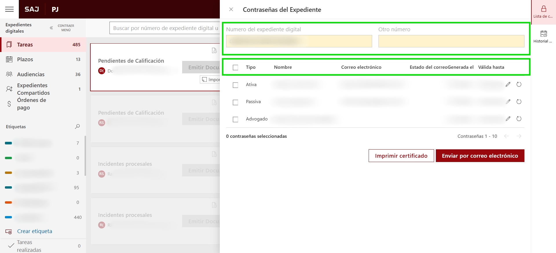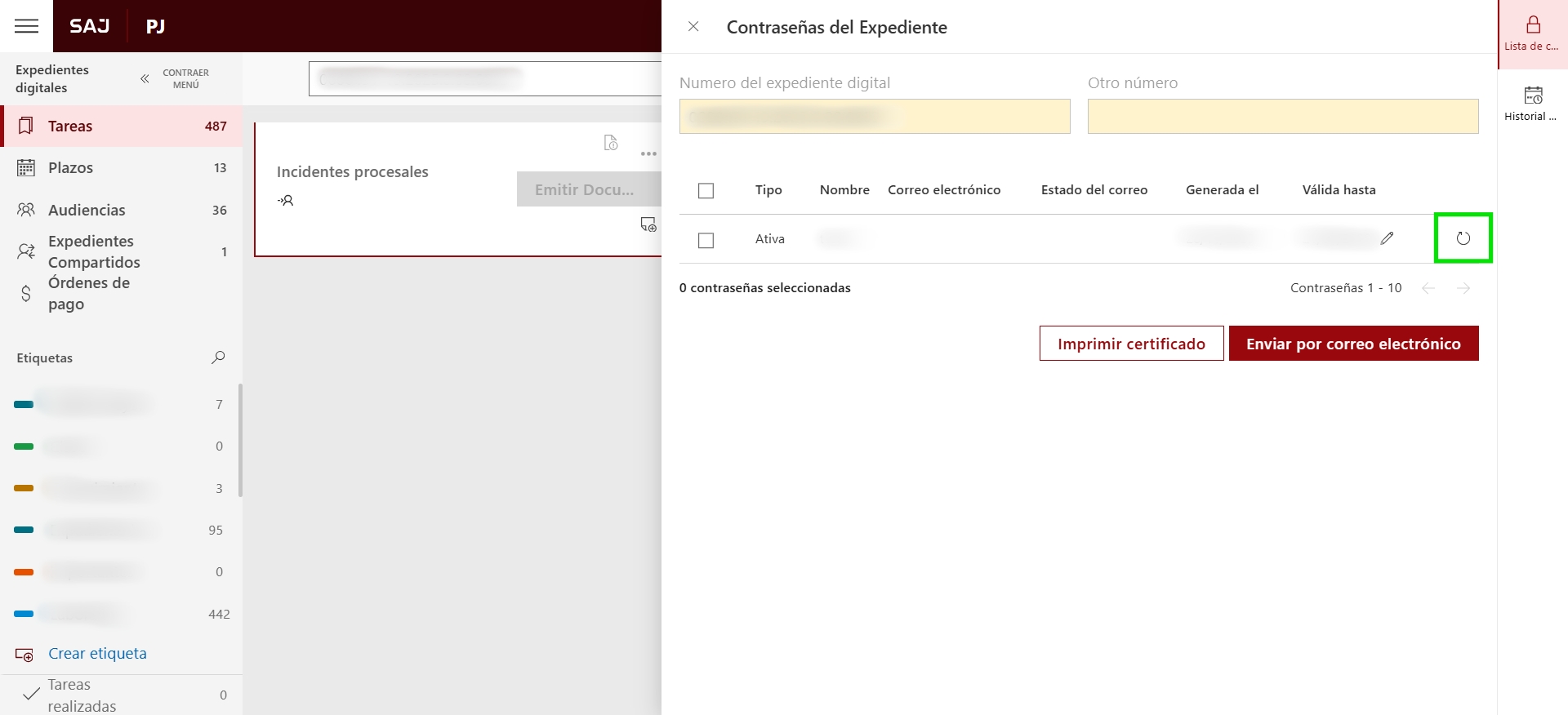 La ventana Contraseñas del expediente permite enviar por correo electrónico, imprimir o generar una nova contraseña para las partes.