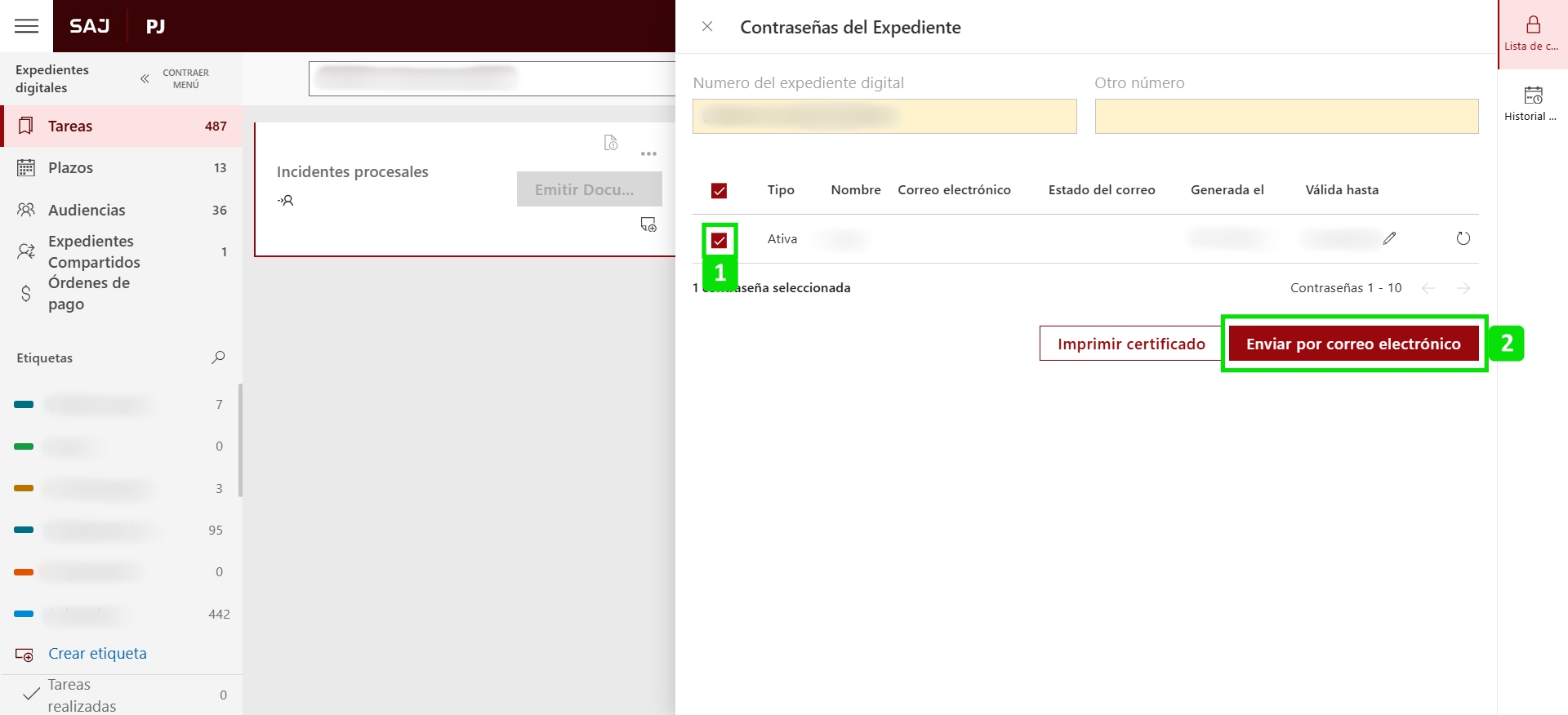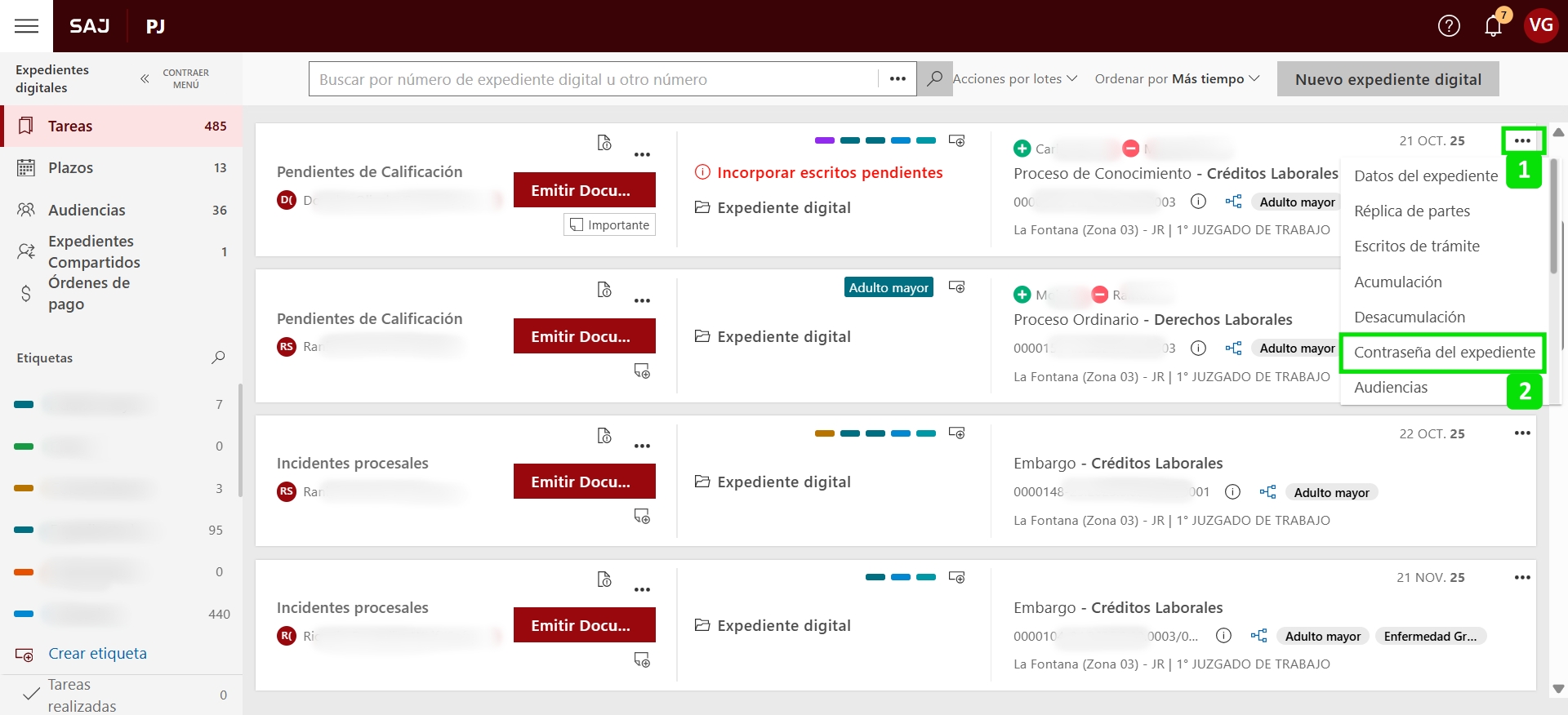 Para realizar la emisión de contraseñas para las partes, en el Panel de Tareas, haga clic en el botón "Otras operaciones" (1) de la tarea del expediente digital deseado y seleccione la opción "Contraseña del expediente" (2).