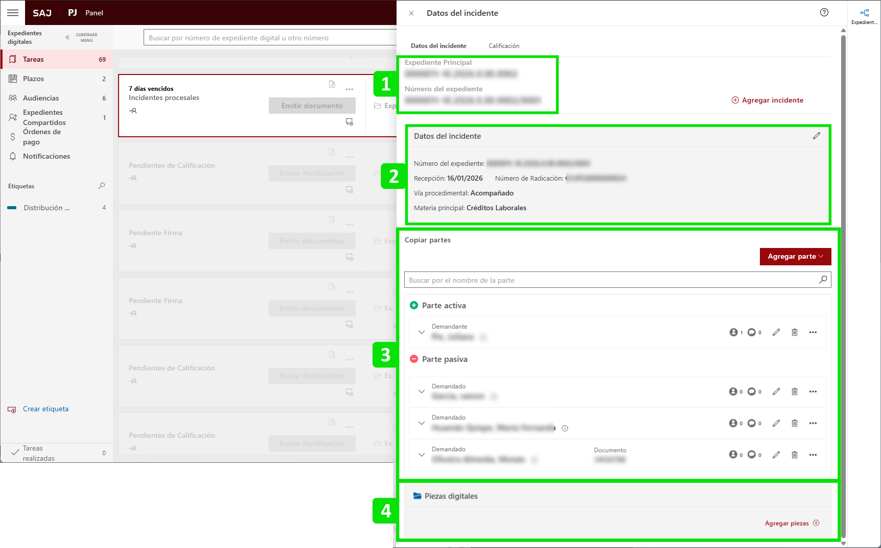La ventana de mismo nombre se cargará presentando los números del expediente (1), los datos del incidente (2), las partes (3) y las piezas digitales (4).