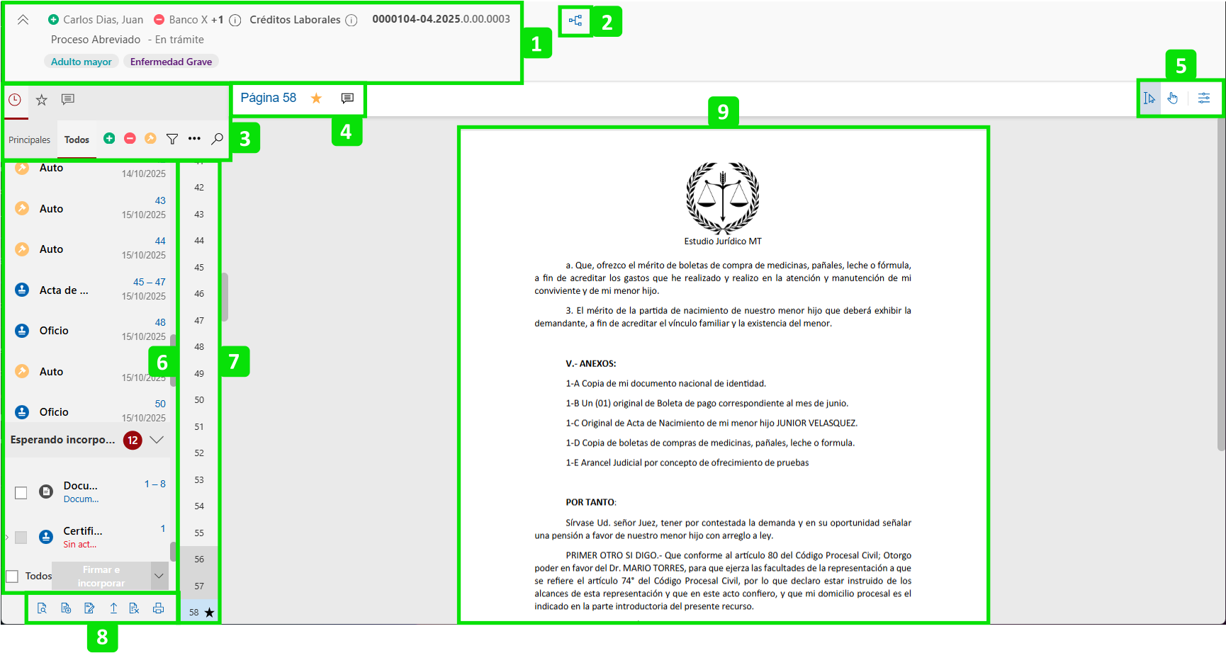 - (7) Regla de páginas, con toda la numeración del expediente. Por medio de ella también es posible identificar las paginas favoritas, si hay anotaciones realizadas y si hay algún contenido bajo confidencialidad absoluta.