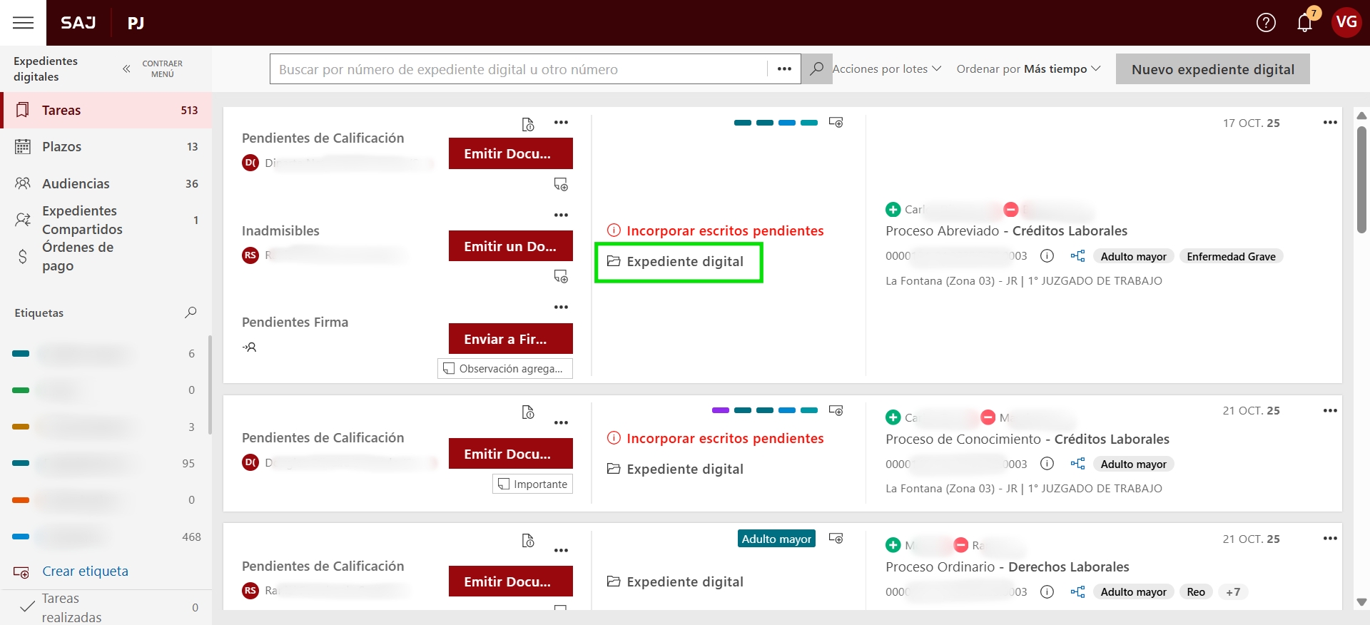 Para acceder al Expediente Digital de un determinado expediente, en el Panel de Tareas, haga clic en "Expediente digital" de la tarea del expediente deseado.