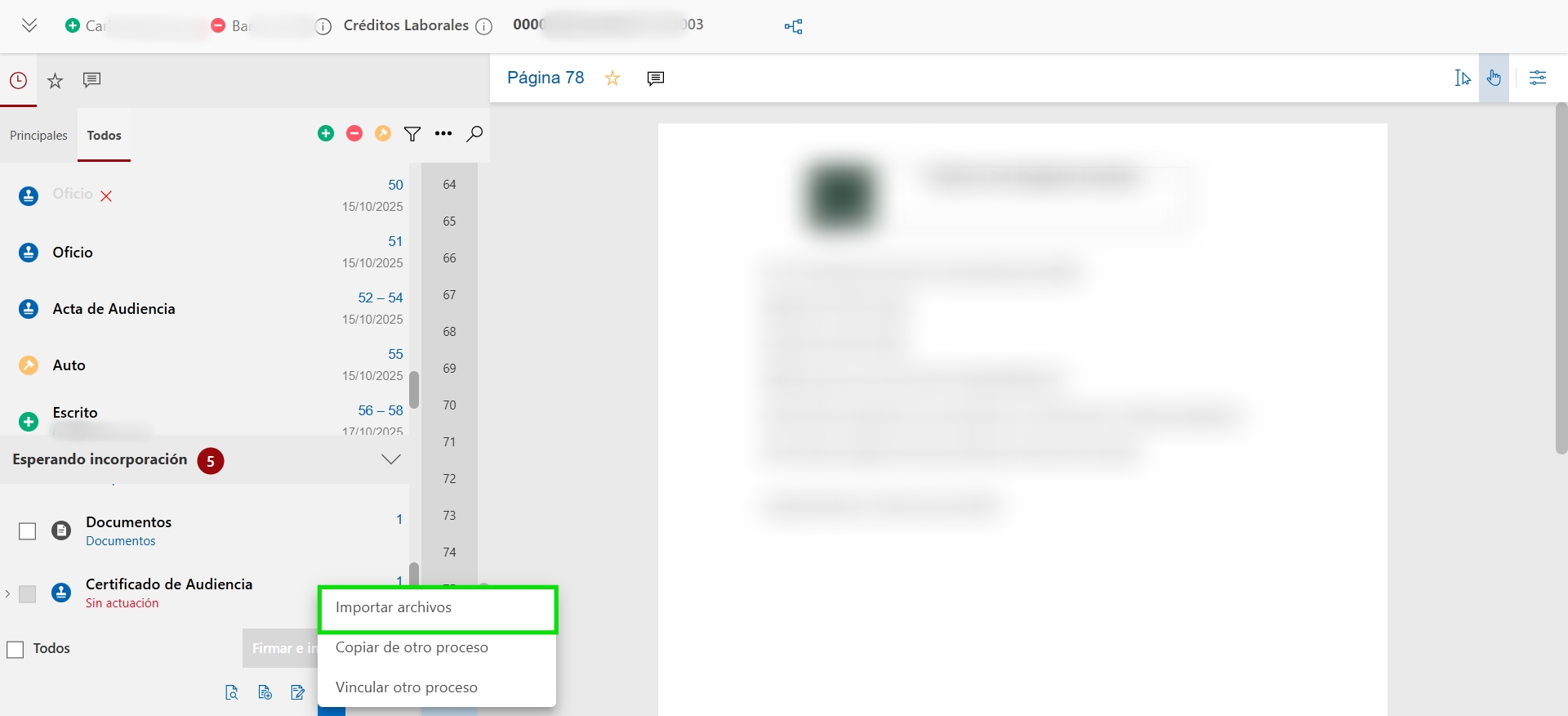 Mientras el sistema procesa la importación del archivo, se puede continuar navegando por el expediente.