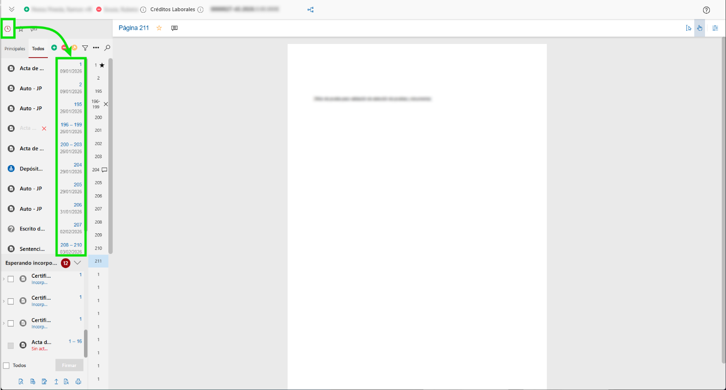 La Carpeta del Expediente Digital presenta, por estándar, las páginas y documentos en orden cronológico.