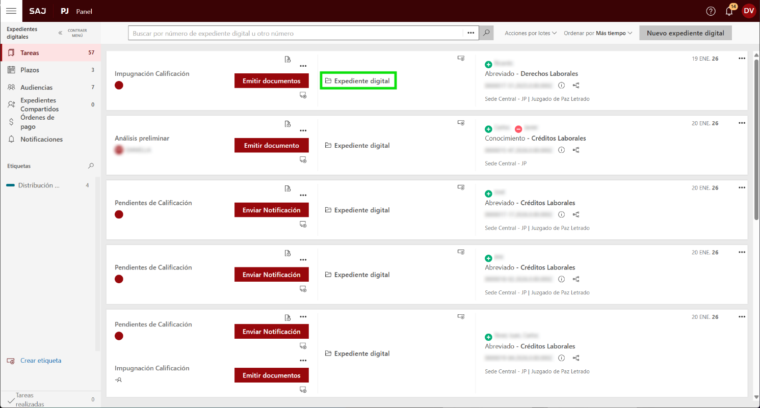 Para acceder a Carpeta del Expediente Digital, en el Panel de Tareas, haga clic en "Expediente digital" de la tarea del expediente deseado.