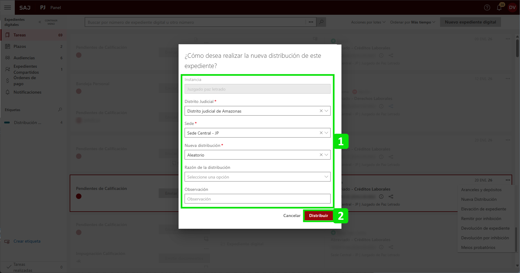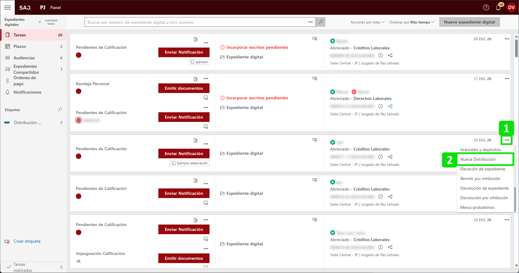 En el Panel de Tareas, haga clic en el "Otras operaciones" (1) de la tarea del expediente deseado y seleccione la opción "Nueva distribución" (2).