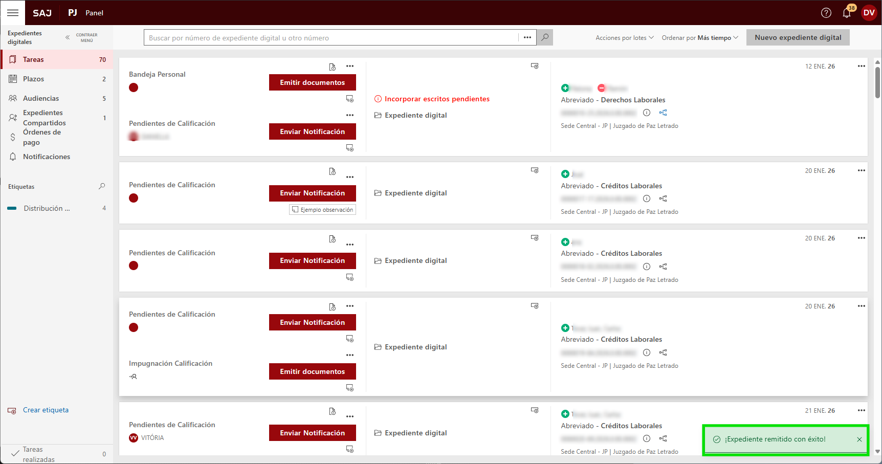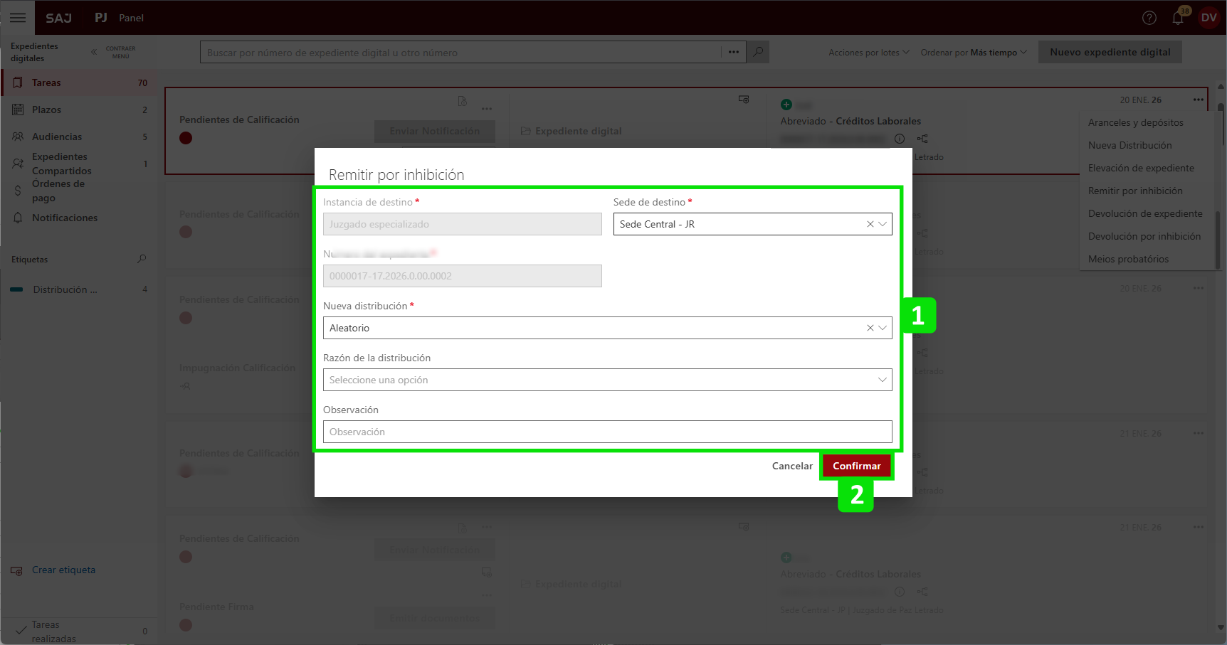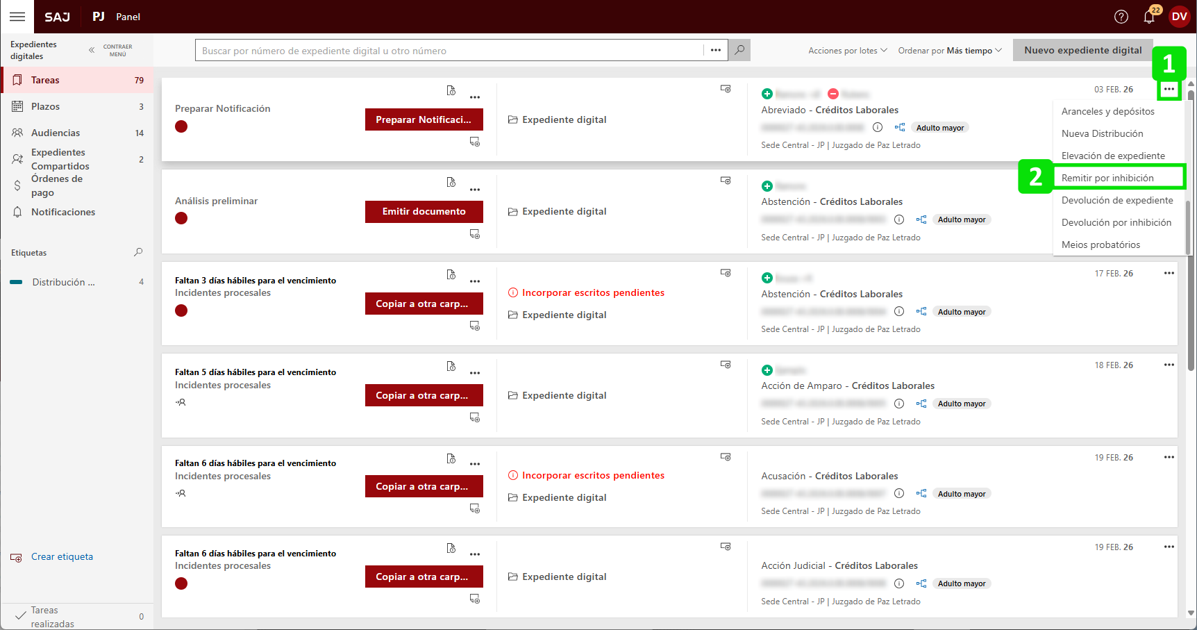 En el Panel de Tareas, haga clic en el "Otras operaciones" (1) de la tarea del expediente deseado y seleccione la opción "Devolver por inhibición" (2).